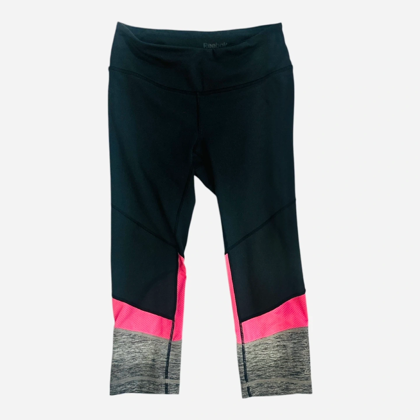 Reebok activewear capri leggings in black with pink and grey accents. Comfortable stretch fabric for workouts. They're great for running or gym sessions!