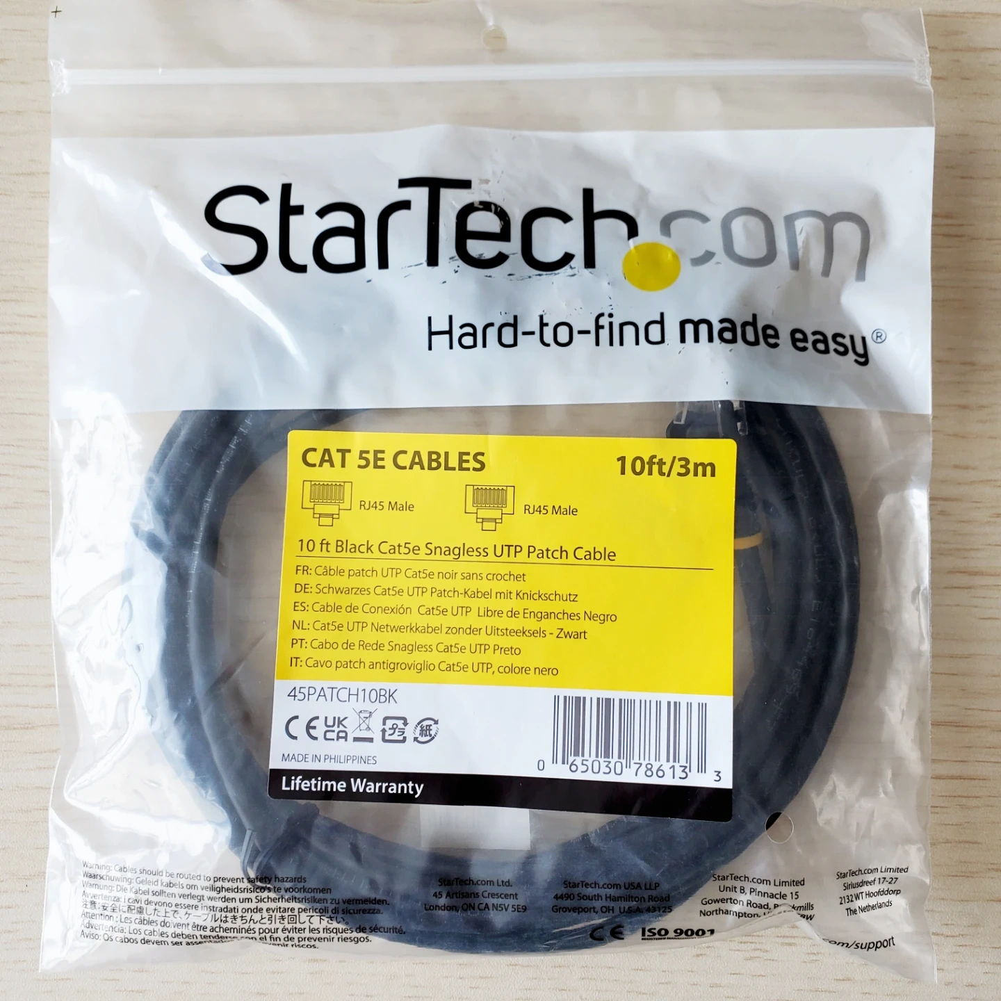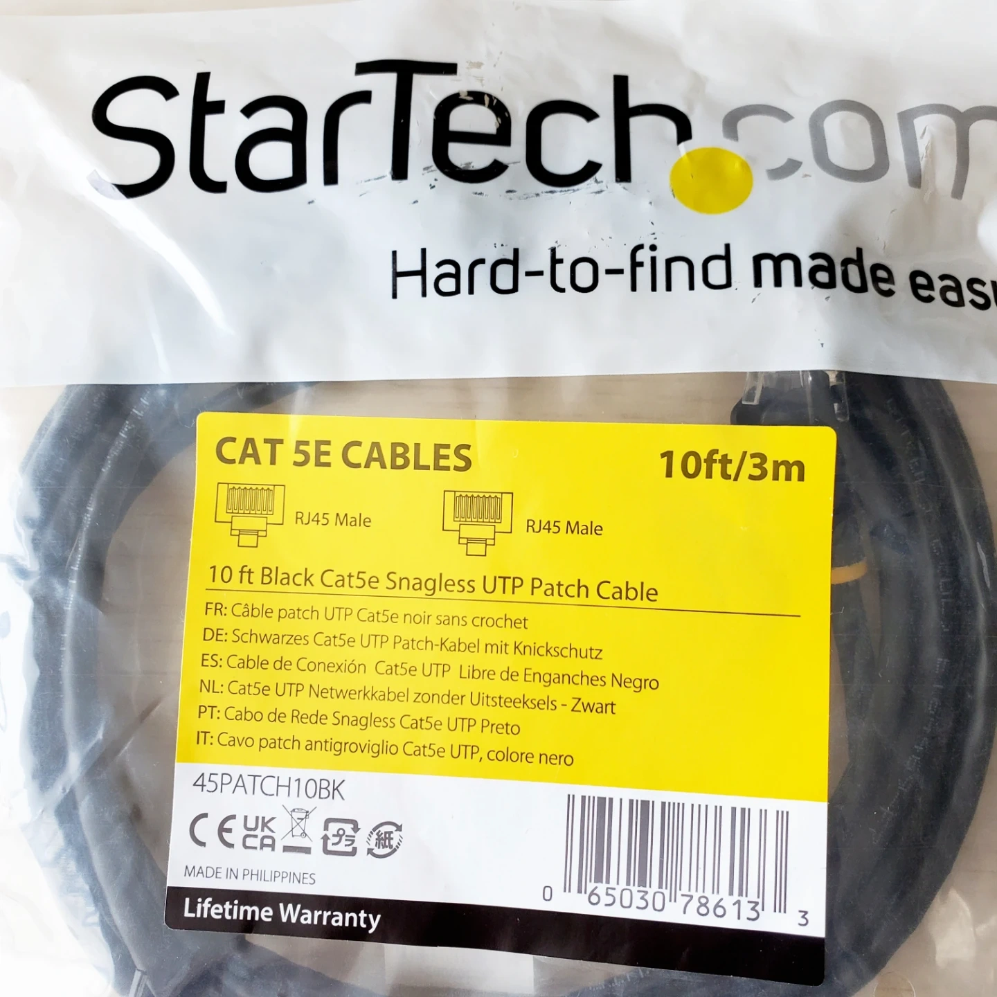 This is a brand new, 10-foot black Cat5e UTP patch cable. It features RJ45 male connectors and is snagless. Ethernet cable that connects your laptop or desktop to the router or modem.