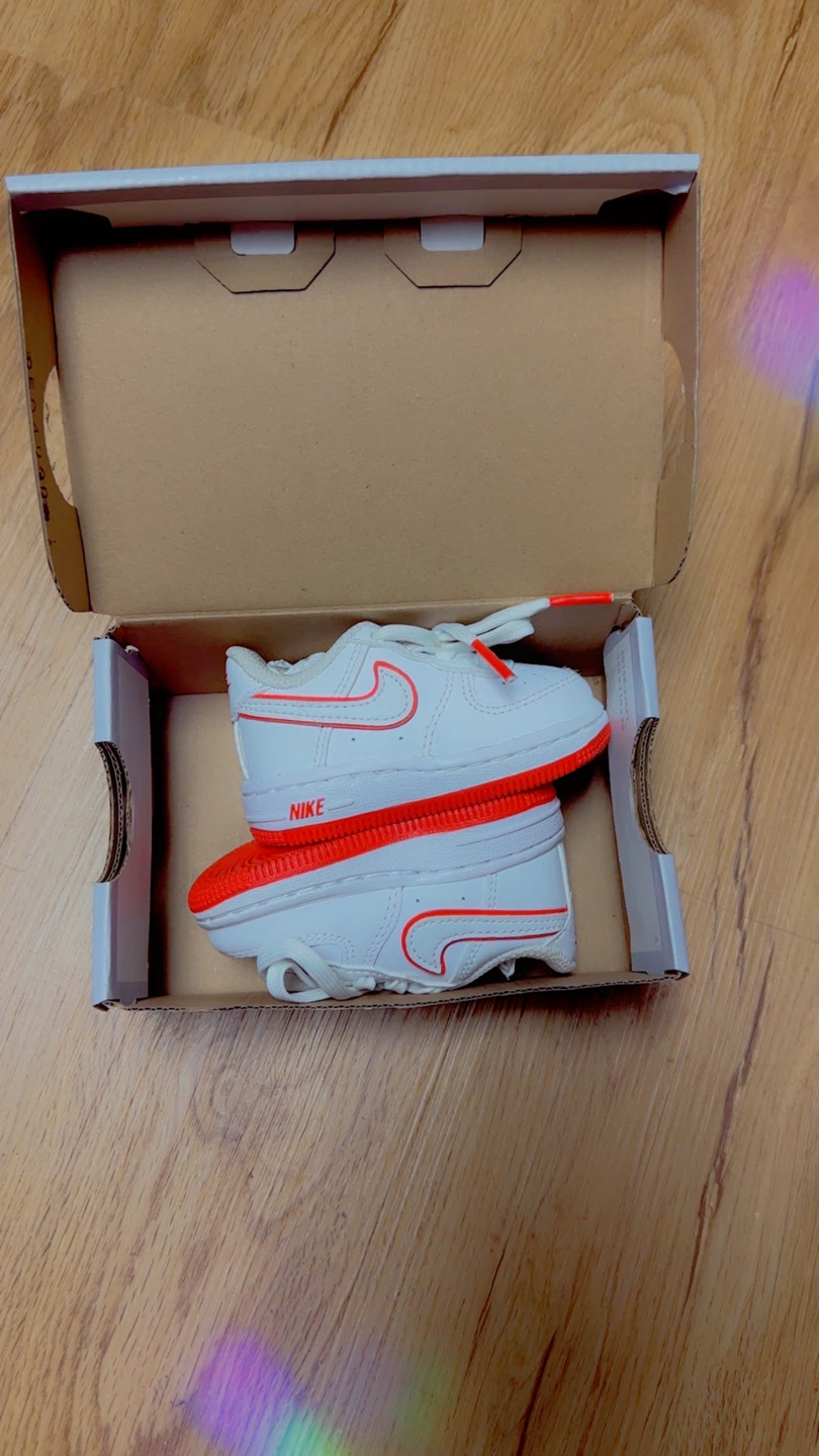 These adorable Nike Air Force 1 toddler shoes are in excellent condition and ready for a new home! They are white with a vibrant red swoosh and accents. Size is a US 3 .Comes with the original box