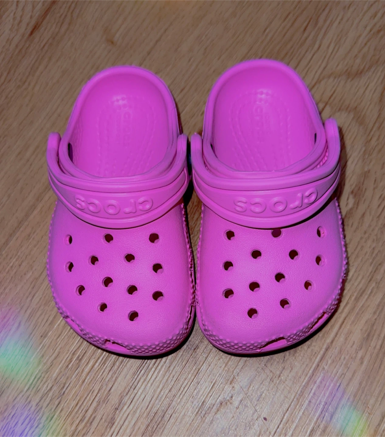 Selling a pair of pink Crocs in kids size 6. They show some signs of wear on the front, but still have lots of life left!