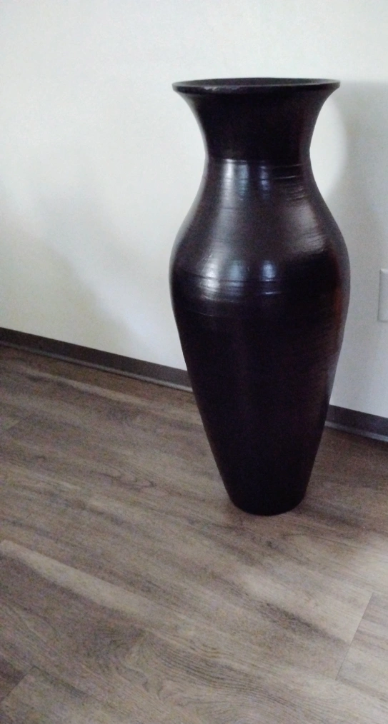 Sleek black very rare decorative floor vase with a nice height of 31" H, the top measures at 10" W and the neck filters down to about 8". I believe that it is made out of bamboo, I got it 2nd hand aswell so I'm not too sure on the brand either