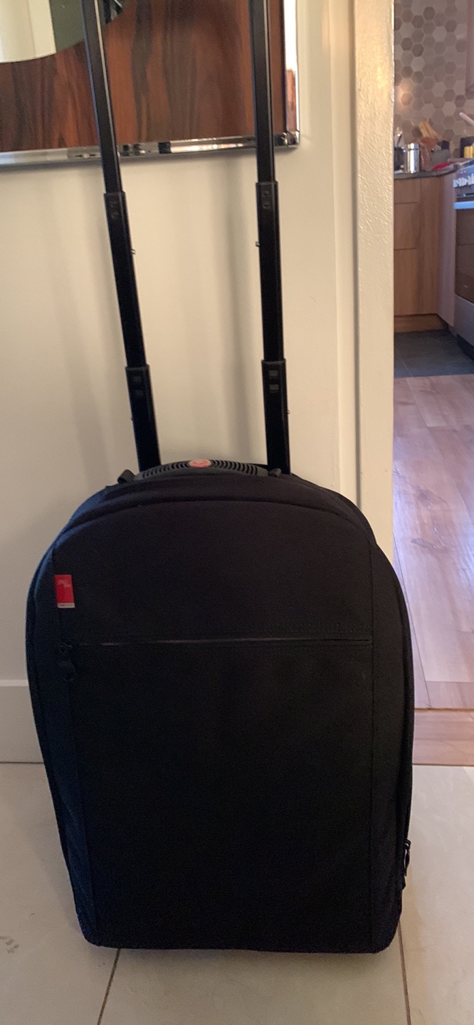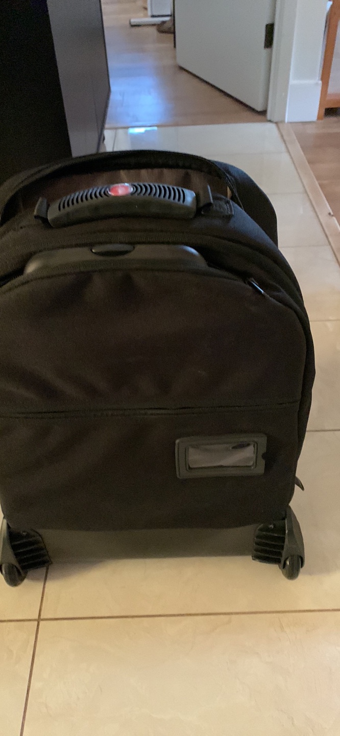 Selling a black wheeled rollin bag. It features a retractable handle and multiple compartments inside. Great for travel or school