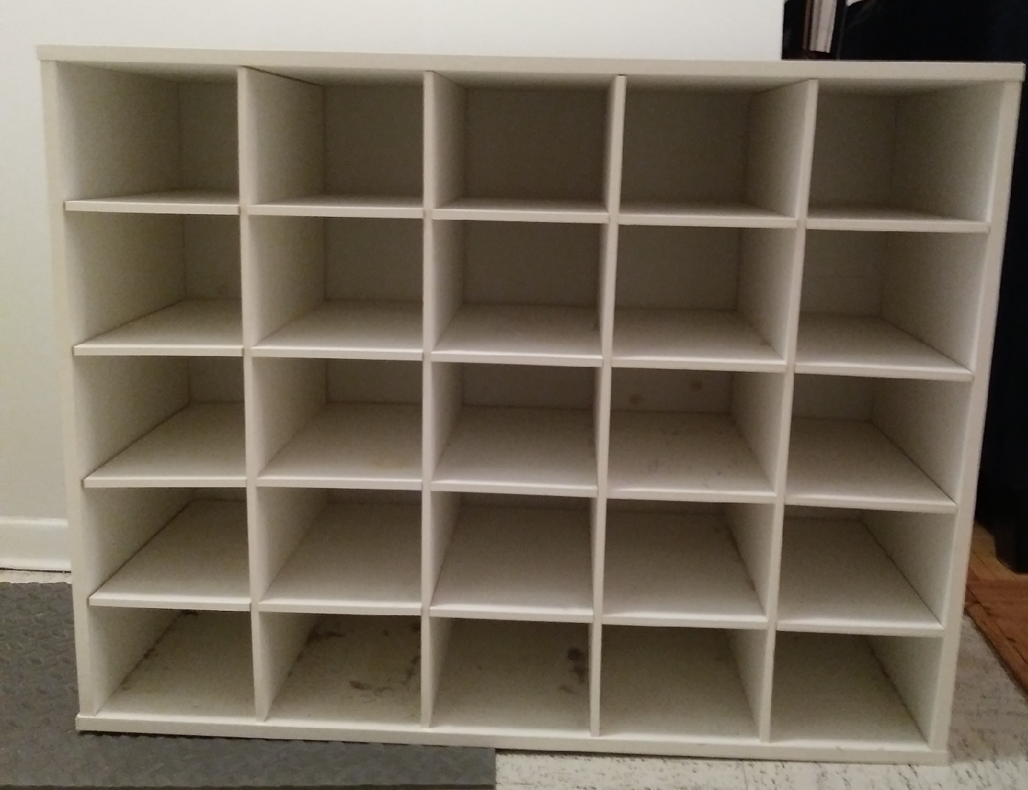 A very sturdy cubby hole storage unit. Probably need two people to carry it. In solid condition but could definitely use a coat of paint. Measurements:
