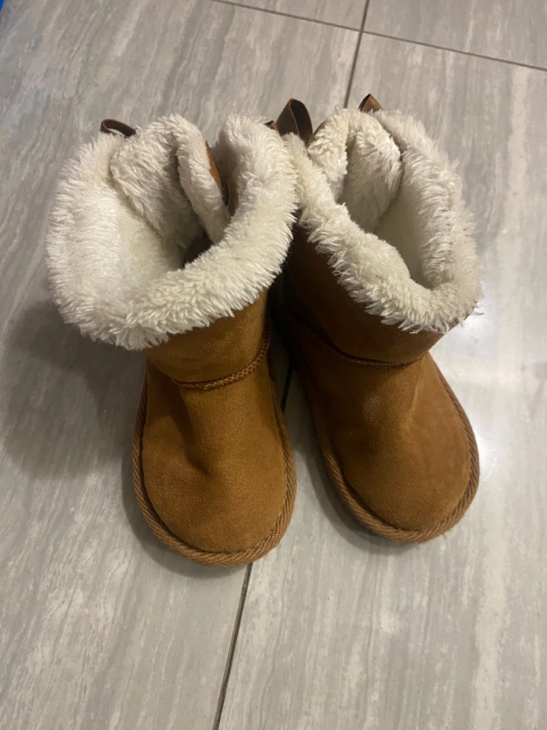 Keep your feet warm this winter with these cozy brown boots! They feature a soft, furry lining and cute ribbon details. The size is 7.