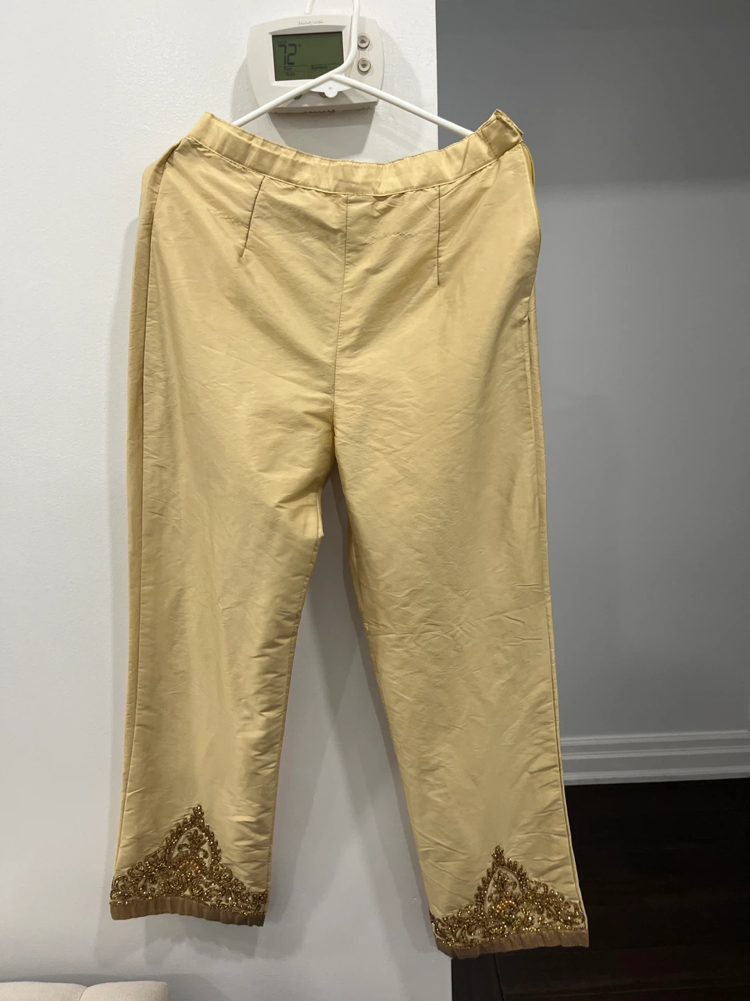 20Here's a beautiful salwar kameez suit. It features detailed embroidery and comes with pants and a dupatta. The top is a vibrant blue, and the pants are a lovely gold colour. It's in great condition and would be perfect for a special occasion