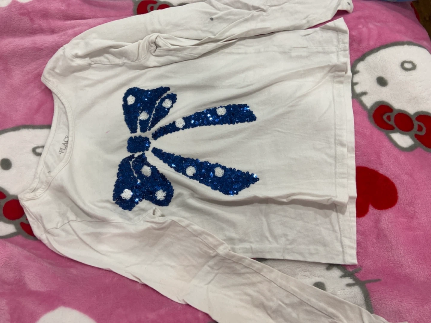 65A cute white long-sleeve shirt from Children's Place! It has a blue sequined bow design on the front. Perfect for layering or wearing on its own