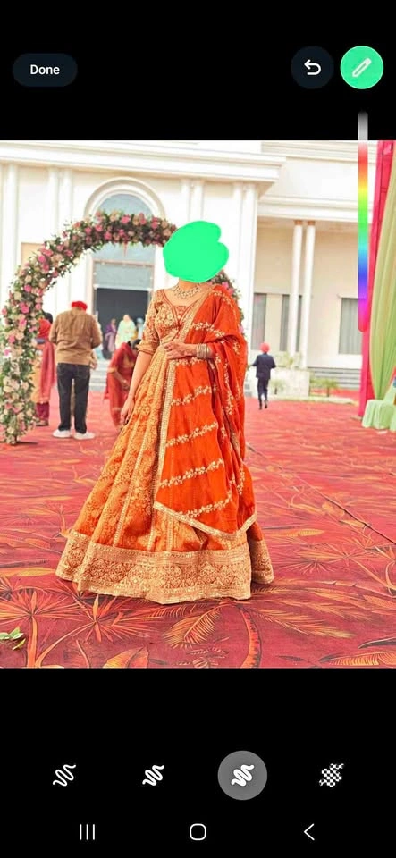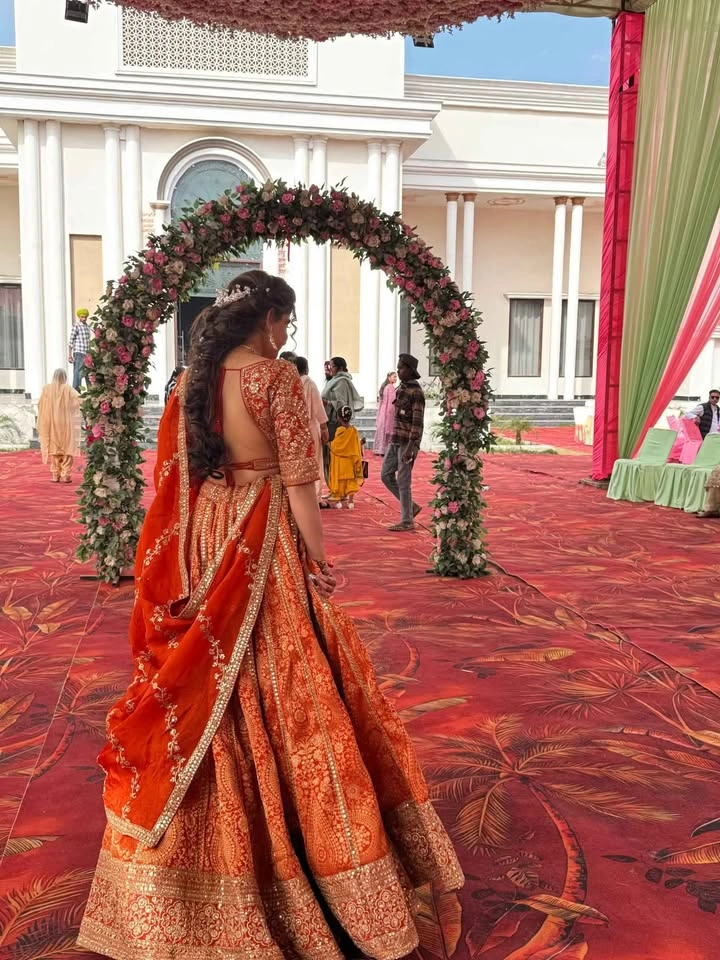 10Heavy embroidered work lehnga bought it for a family function. It's like new, worn only once. Full set comes with blouse, skirt, dupatta, and cancan underneath. Very beautiful design and orange color in trend. It would fit perfectly to size S to M women.