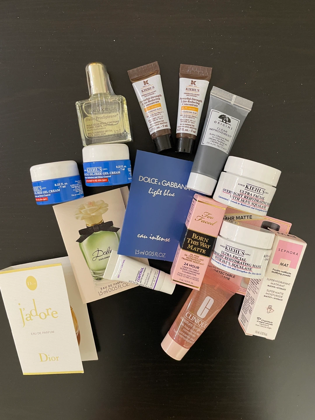 An ssortment of skincare samples and travel sizes! Includes brands like Kiehl's, Dior J'adore, Origins, Dolce & Gabbana, Too Faced, Clinique, and Sephora. Perfect for trying out new products or for travel