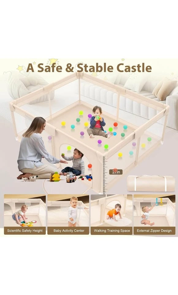 It is easy to install, no tools are needed, just follow the instructions and it can be installed in 10 minutes. The structure is sturdy, using slot or suction cups to ensure the stability of the baby's movement within the playpen. It is designed to prevent babies from reaching unsafe places, such as stairs and electrical appliances, thus minimizing the risk of accidents.