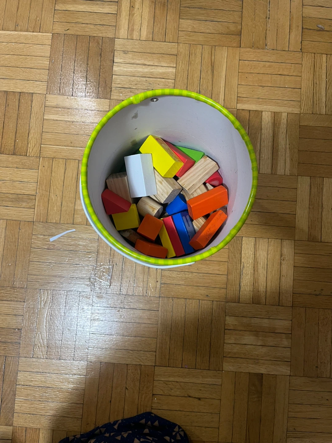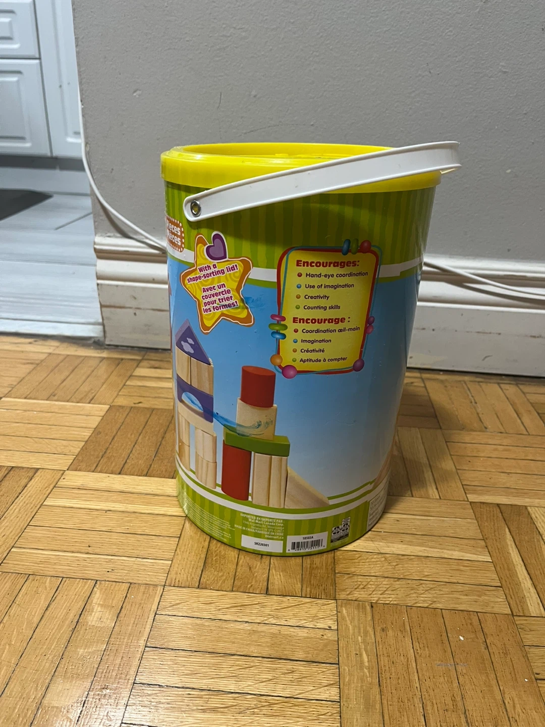 This is a 100 piece wooden block playset! It encourages third-eye coordination, use of imagination, creativity, and counting skills. It also comes with a shape-sorting lid!e may be like very few pieces are missing, smoke free and pet free