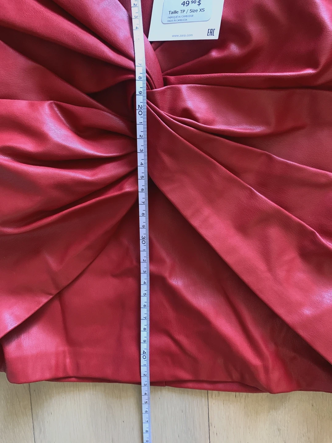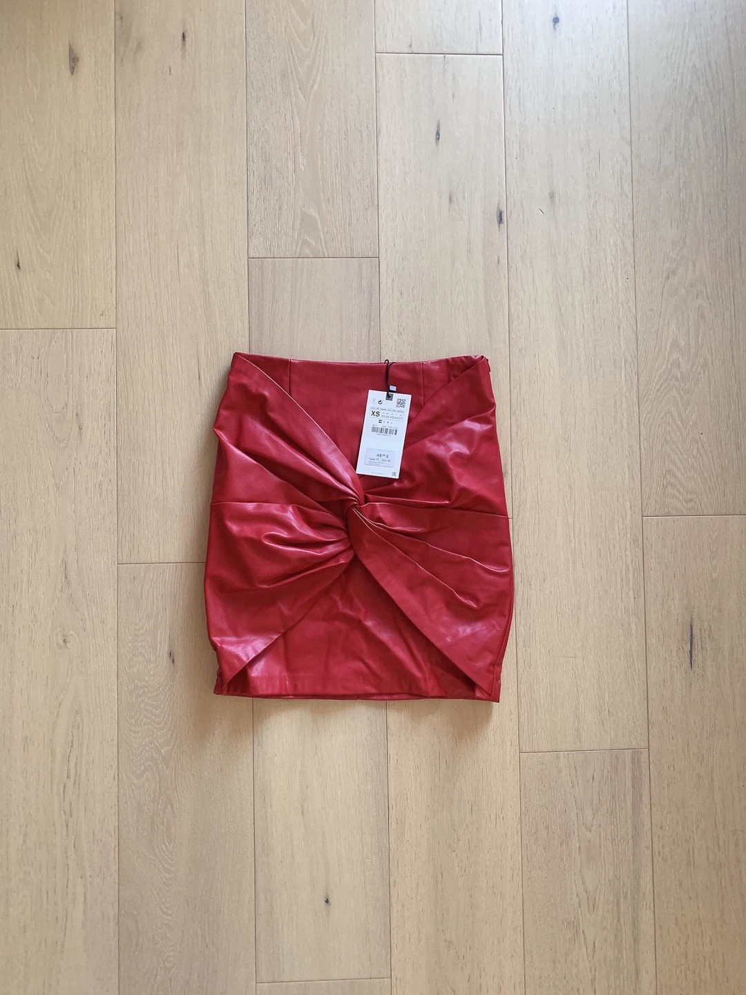 31Selling a Zara red faux leather mini skirt in size XS. It features a unique knot detail at the front. Originally bought for $49.90! Brand new with tag Length 43cm Waist 66cm