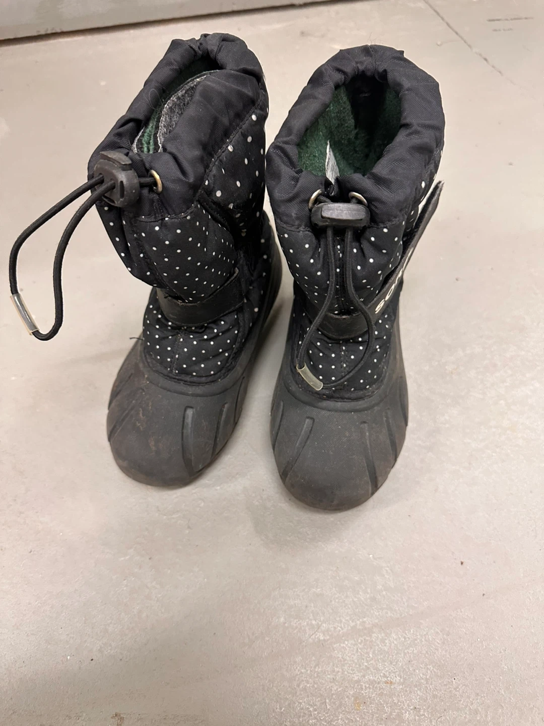 Selling a pair of Sorel Snow Commander boots in black with a cute polka dot pattern! They're a size 11 US, perfect for keeping little feet warm and dry during the winter months. These boots are super durable and ready for lots of snowy adventures