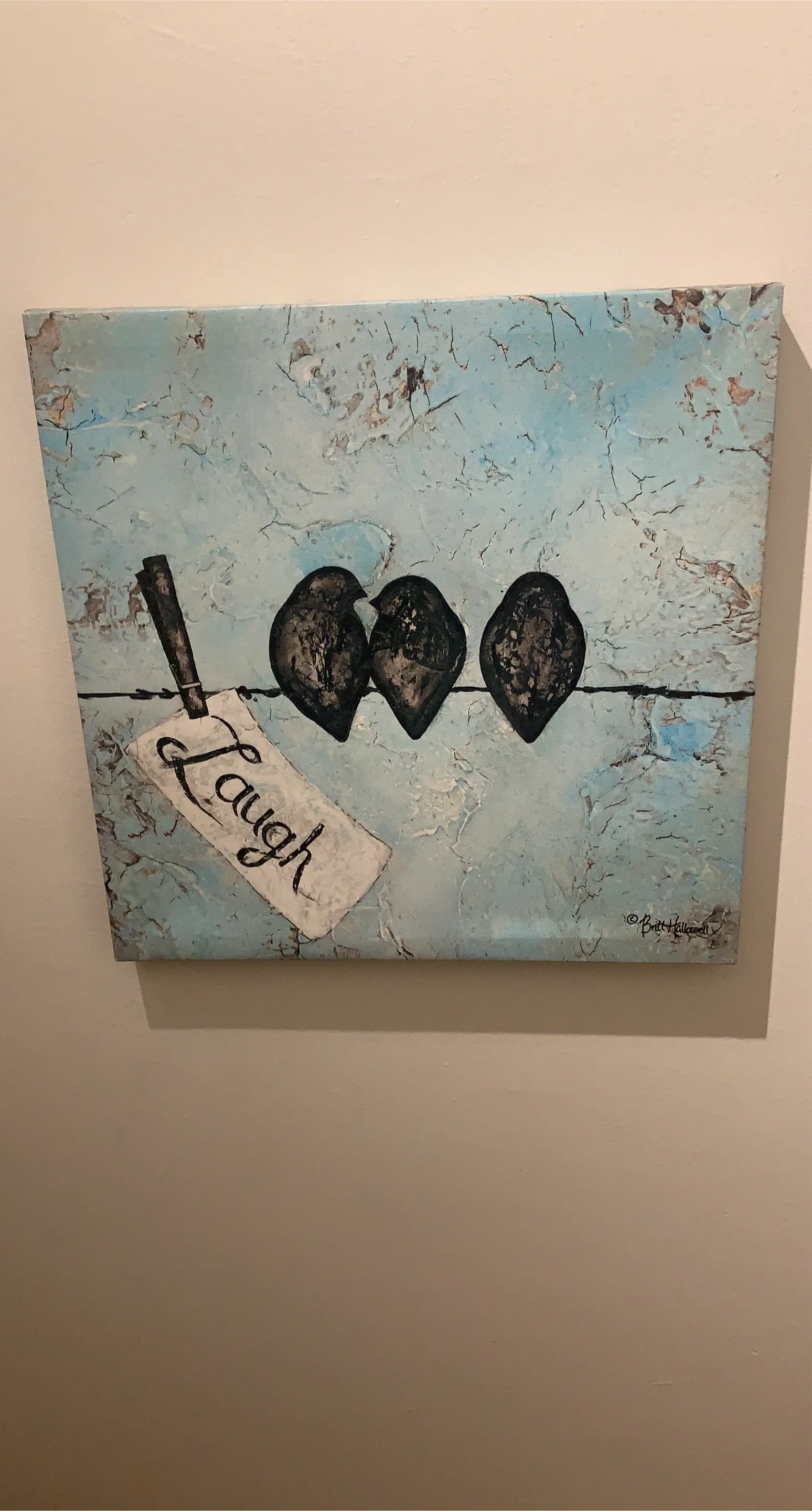 A charming canvas painting featuring three birds perched on a wire, with a tag that says 'Laugh'. The background has a lovely, textured, light-blue finish. It's signed by the artist, Brett Hollowell, adding a unique touch to this piece of art