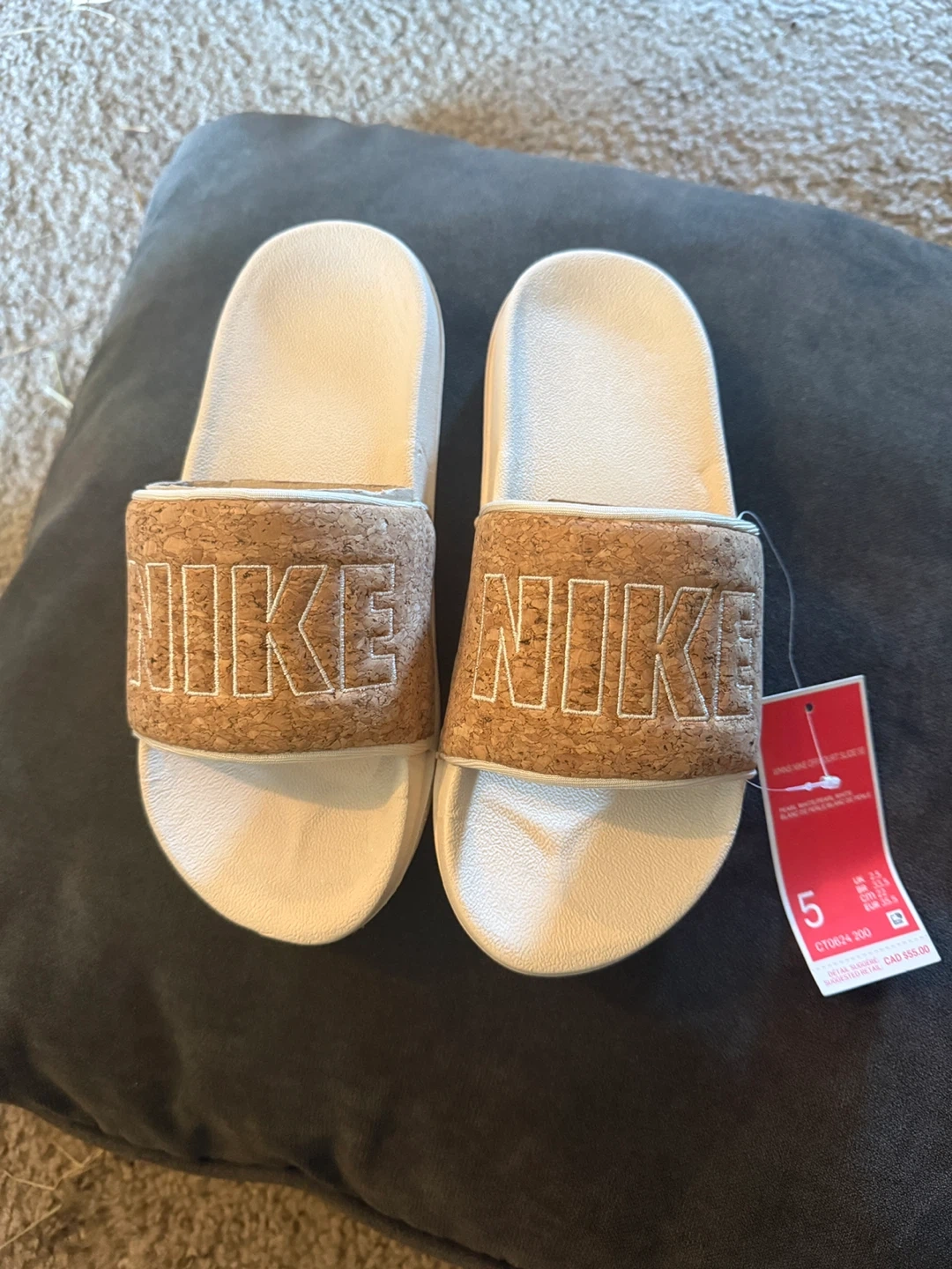 Selling a pair of Nike Victori One slides in a women's size 5. They feature a stylish cork design and are in great condition! The colour is Pearl White/Pearl White.