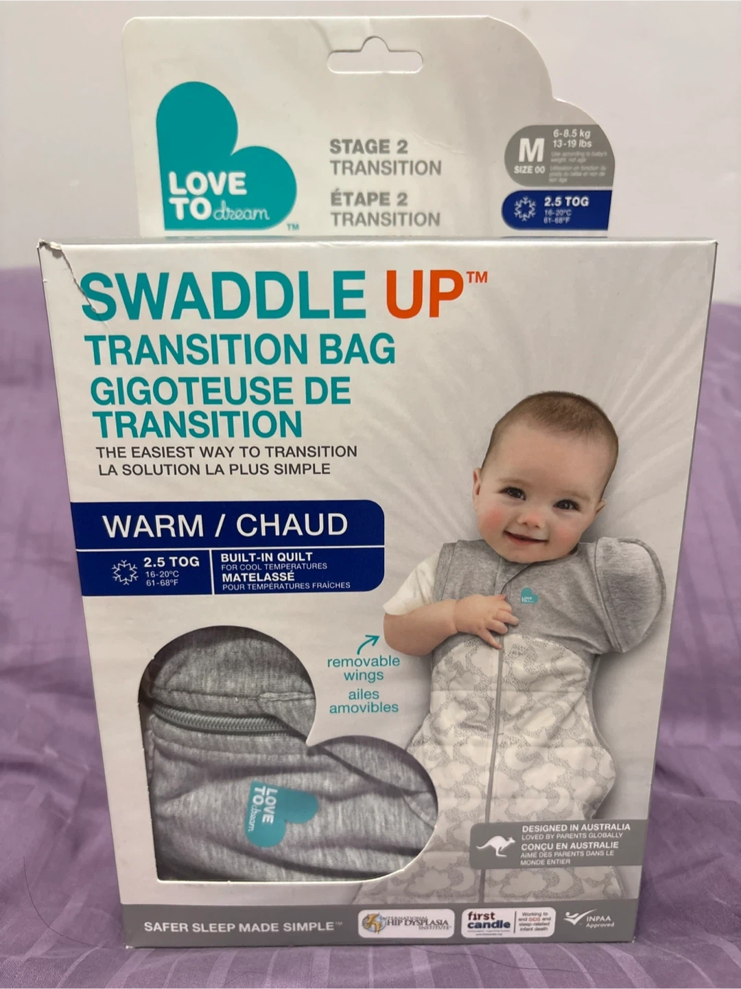 Keep your little one snug with this Love to Dream Swaddle UP Transition Bag! It's a Stage 2 transition bag, size medium (6-8.5 kg / 13-19 lbs). The 2.5 TOG rating makes it suitable for temperatures between 16-20°C / 61-68°F. Originally bought for $64.95!