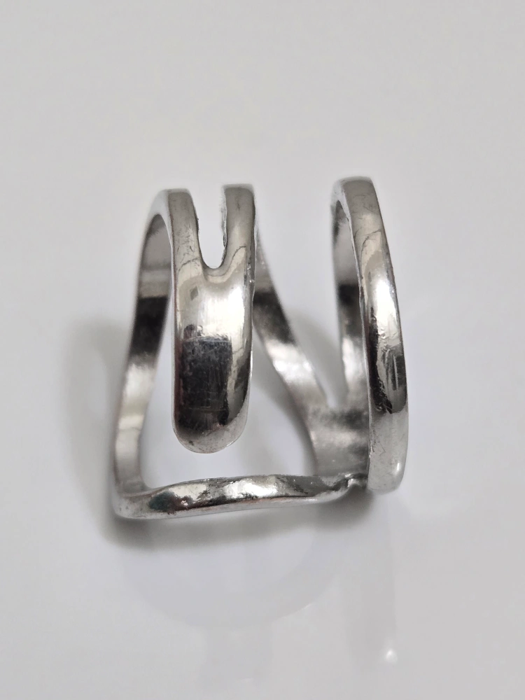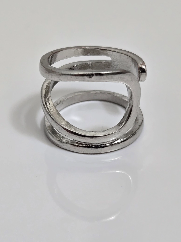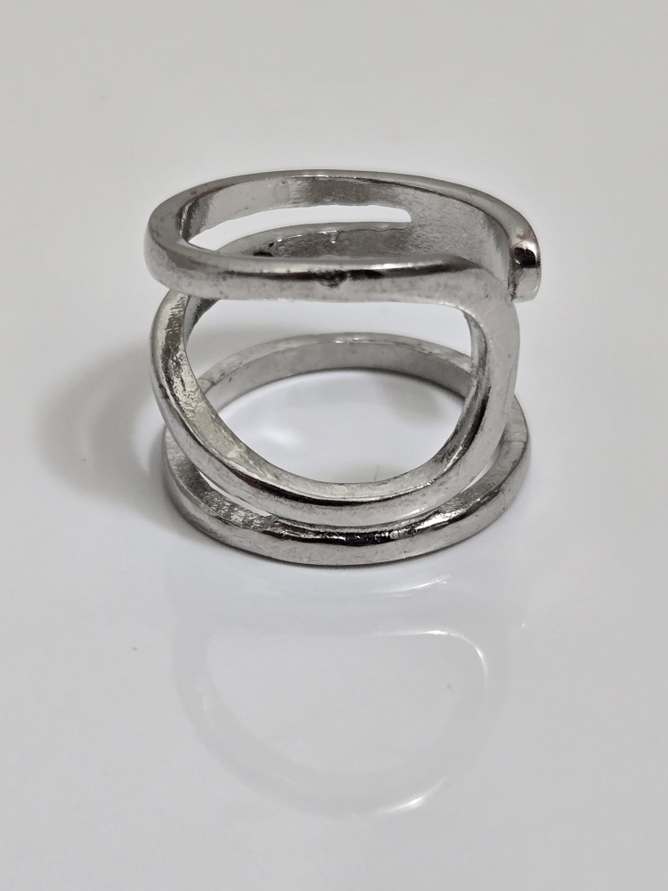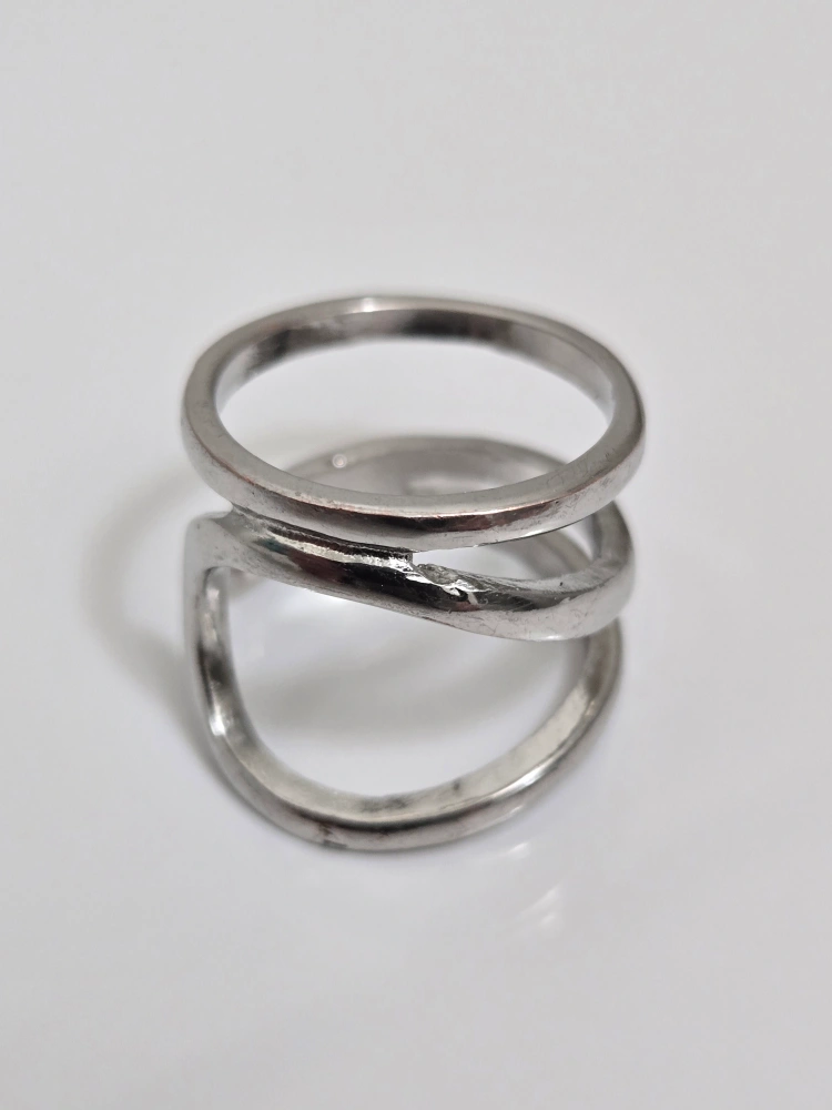 Selling a unique silver-tone ring. It features a modern, multi-band design that's sure to catch the eye. It's in great condition and ready for a new home!