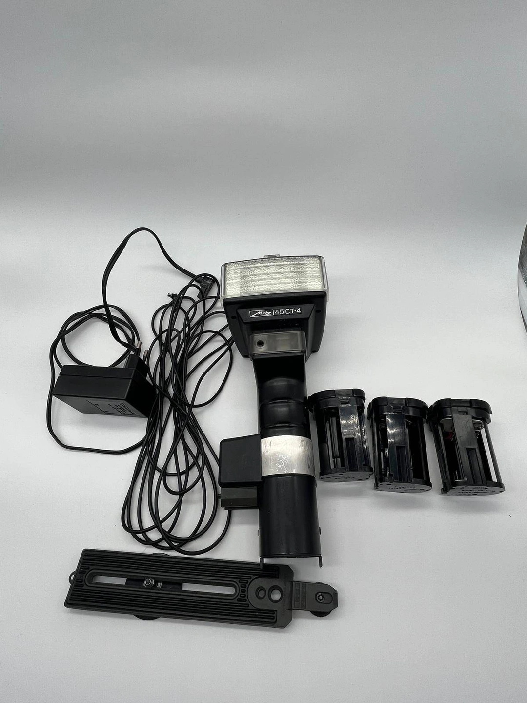 This is a set of photographic flashes and accessories. It includes a Metz 45 CT-4 external flash, three battery packs, a power cord, and a sliding mount. Suitable for use with professional cameras to enhance the lighting effects of your shots. ๐ธ
