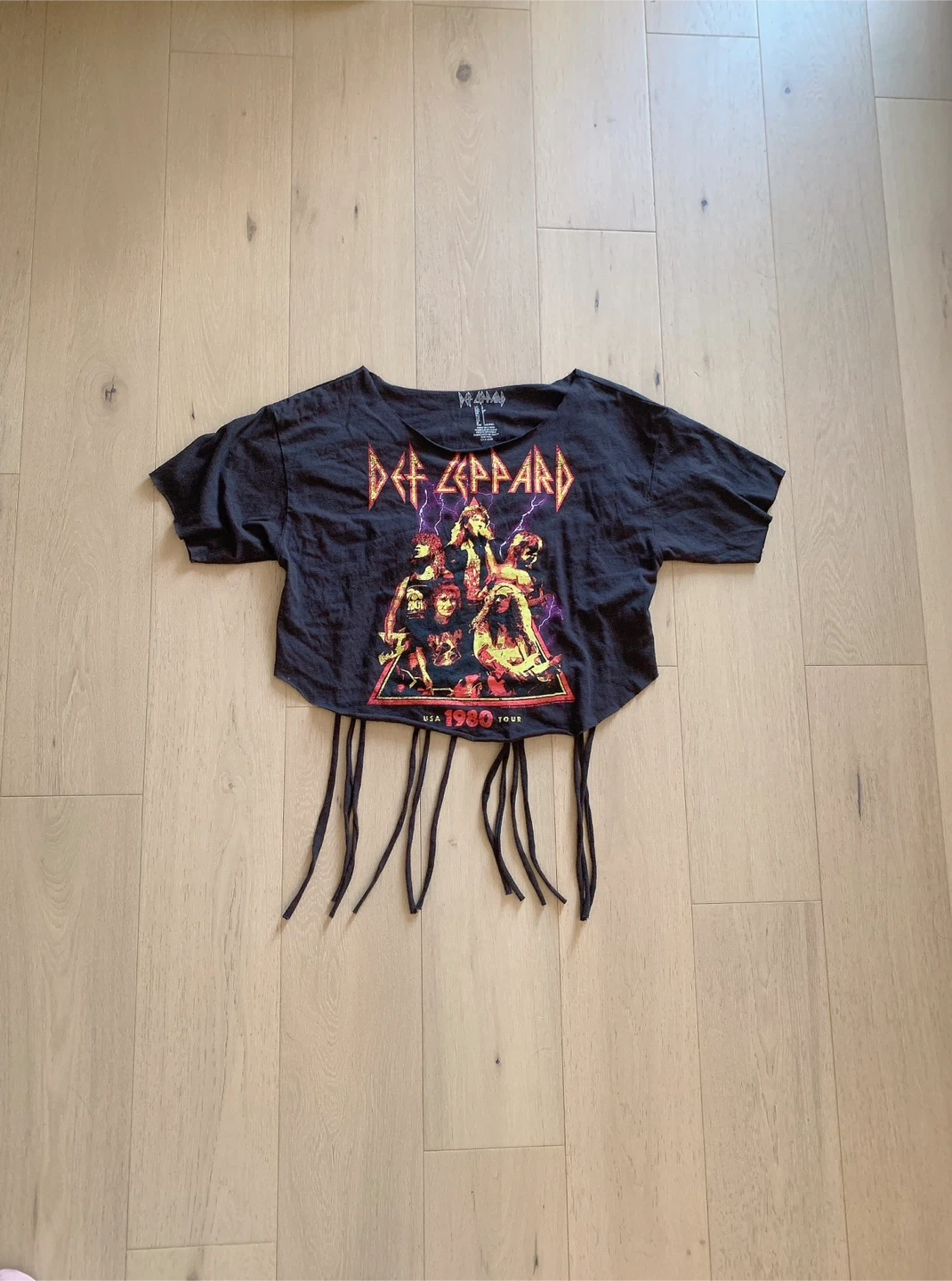 Selling a Def Leppard graphic crop top in size small. It's a black tee with the band's logo and a cool 1980 USA tour graphic. The shirt has some unique fringe detailing at the bottom, giving it a bit of an edgy look. Perfect for any rock fan! Brand new Length 41cm Chest 100cm