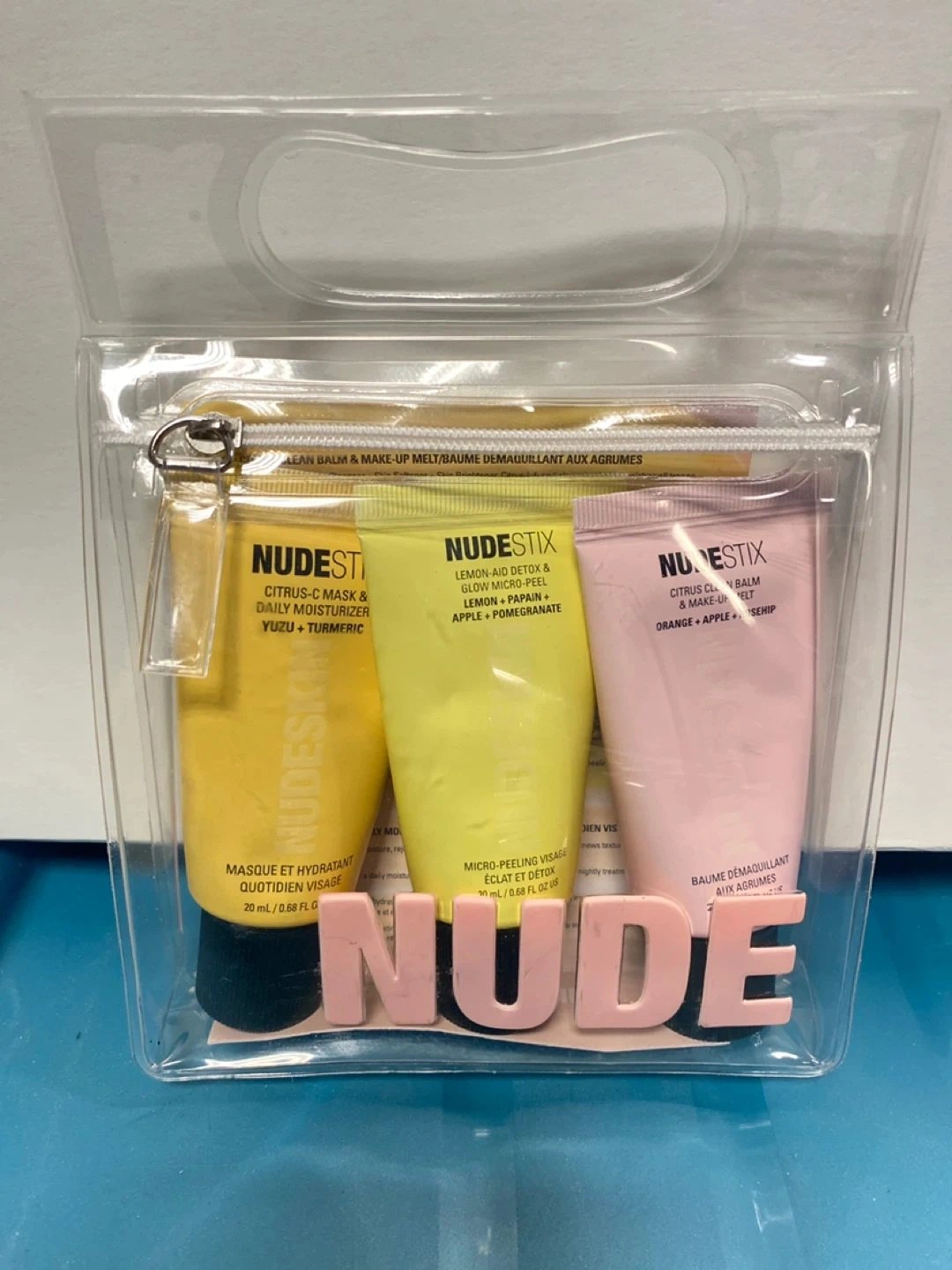 Selling a Nude Stix Nudeskin skin care set. All 3 items are 20 ml each. Included is: Citrus-c mask, Lemon-aid detox and glow micro peel and a citrus clean balm/ makeup melt. New