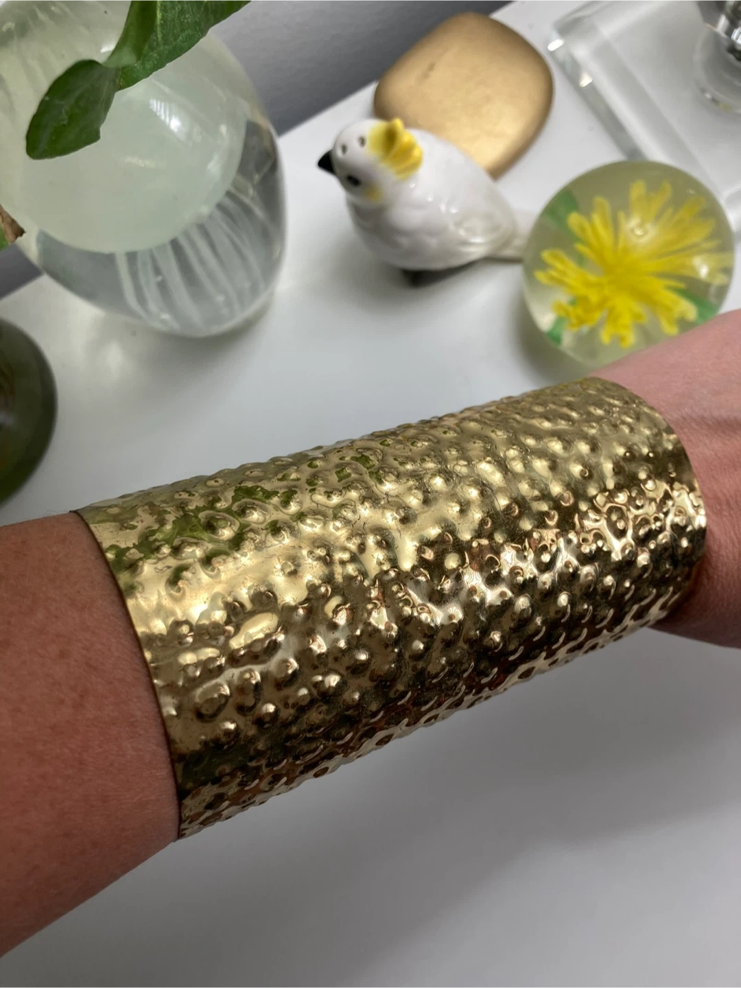 117Looking to add a bit of shine to your outfit? This gold-toned cuff bracelet has a unique hammered texture that catches the light beautifully. It's a statement piece that's sure to get noticed!