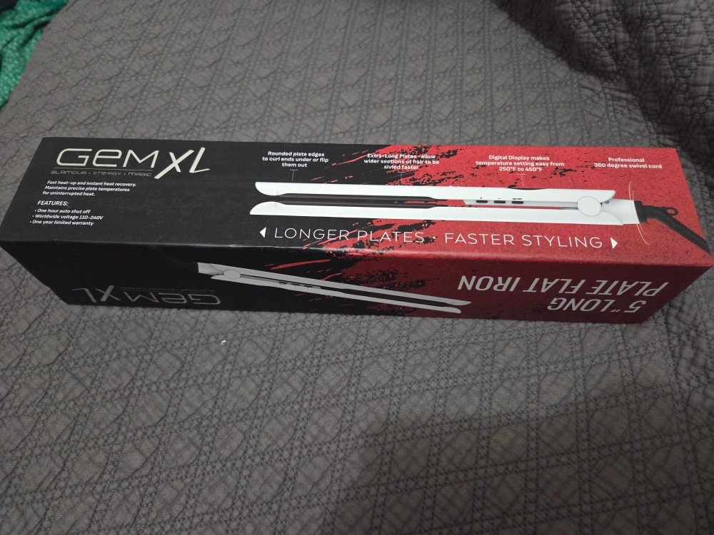 Selling a brand new Gem XL 5" Long Plate Flat Iron! It features rounded plate edges to curl ends or flip for added texture, and extra long plates to style wider sections of hair faster. The digital display makes temperature adjustments from 250°F to 450°F. It also has a professional 360-degree swivel cord. The box is included