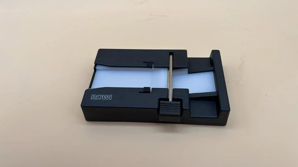 ROWI slide film cutter, designed for precise trimming of photographic slide films. It comes in a clear plastic packaging with an instructional image on the box.