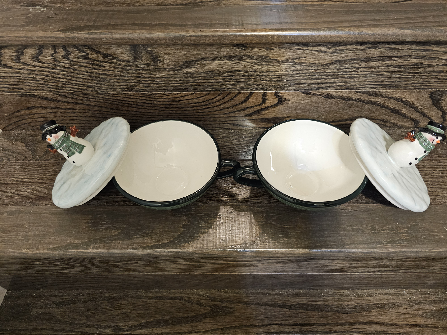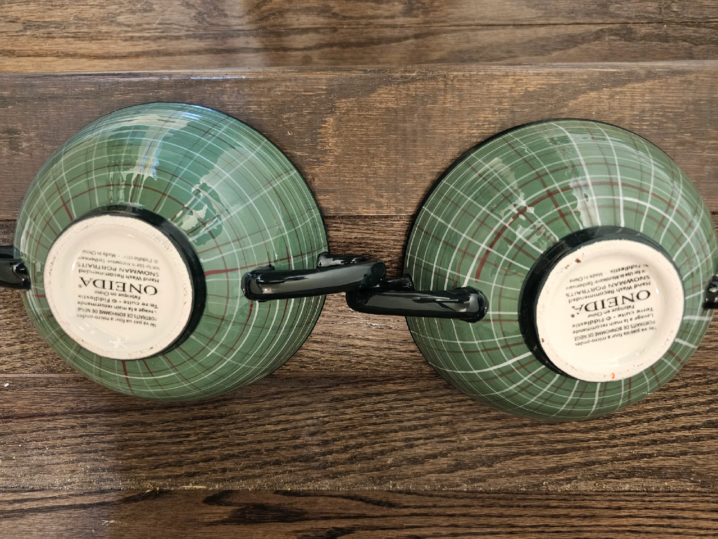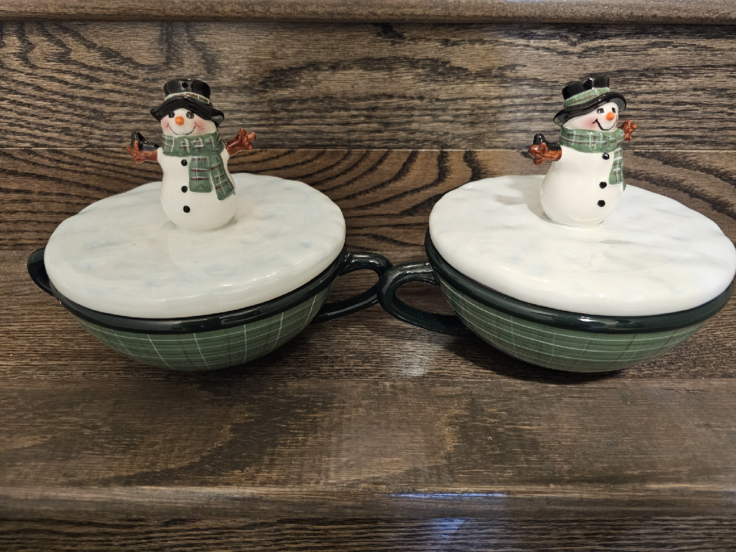 Here's a set of two Oneida soup mugs, each featuring a charming snowman portrait on the lid! The mugs have a lovely green plaid design, perfect for adding a touch of winter cheer to your kitchen. They're in great condition and ready to be enjoyed!