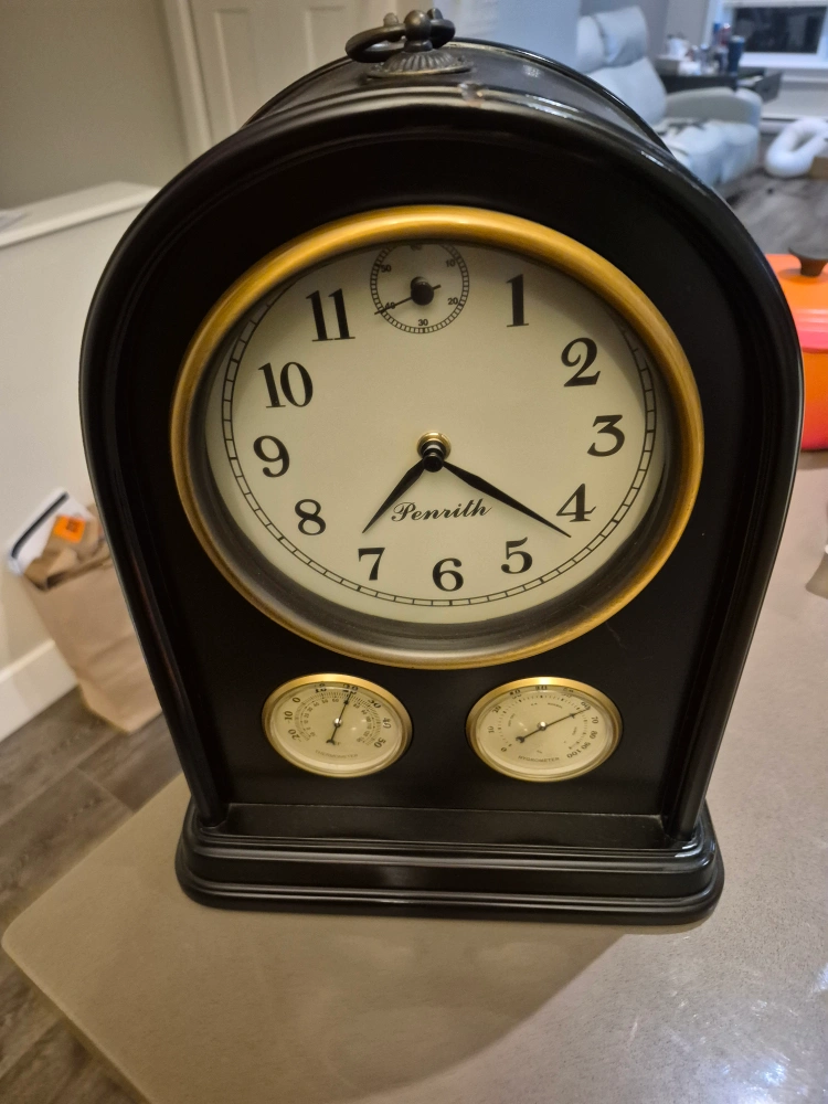 20Selling a lovely Penrith mantel clock. It's in great shape and would look great on any shelf or mantel. Features a beautiful clock face with easy-to-read numbers, as well as thermometer and hygrometer dials.