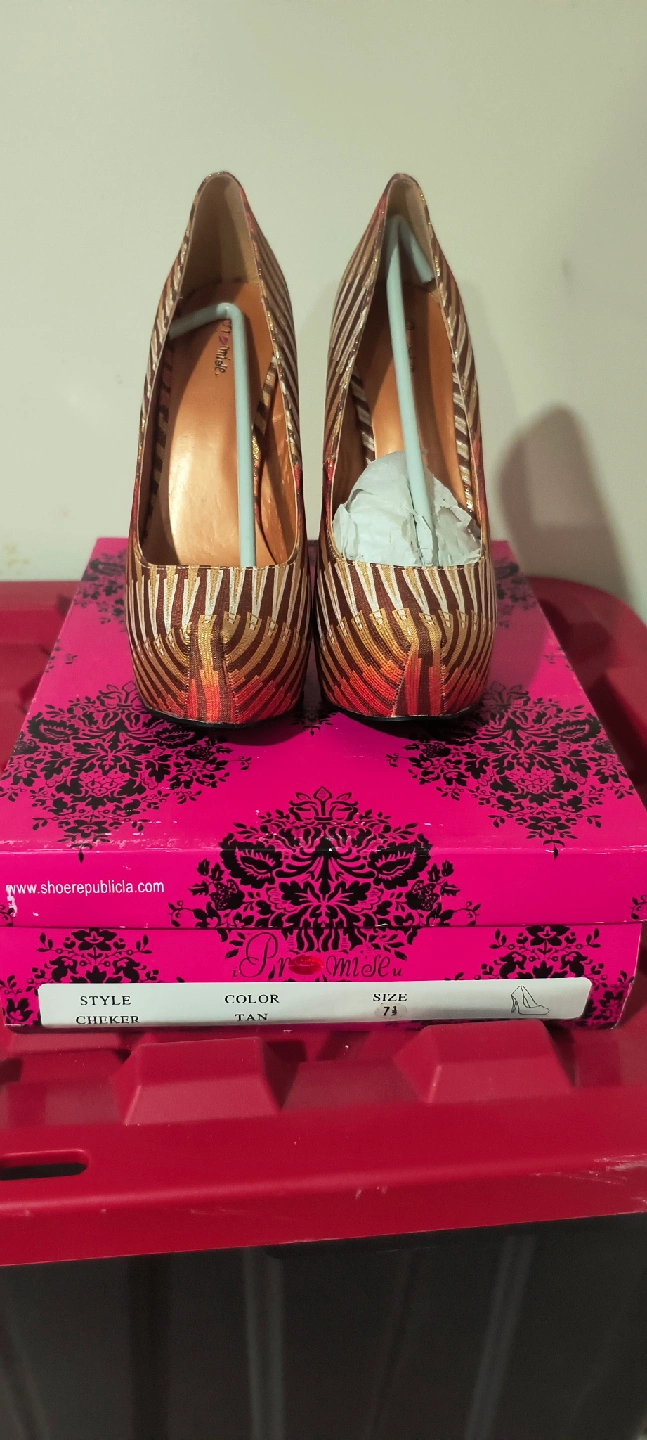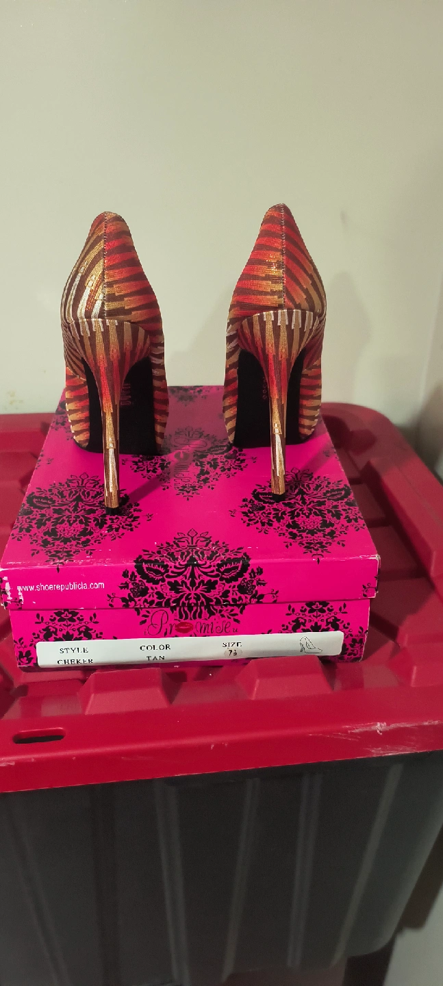 90Selling a pair of Promise heels in tan, size 7.5 The heels come with their original box. They have a stylish striped design and are in great condition!