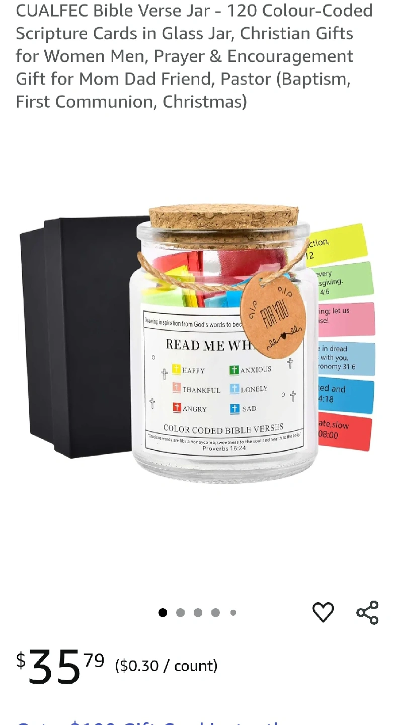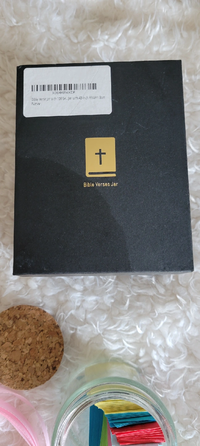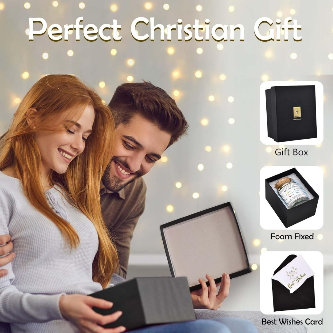 This Bible Verse Jar includes 120 colour-coded scripture cards in a glass jar. It comes with a black box and ribbon. The jar includes colour-coded bible verses for when you are happy, thankful, angry, sad, anxious, or lonely.