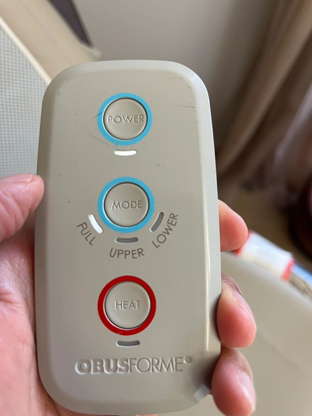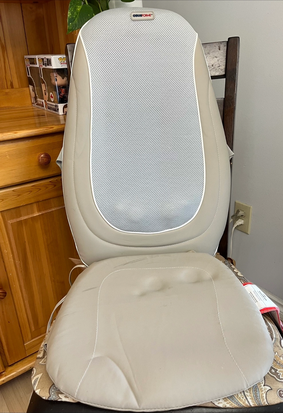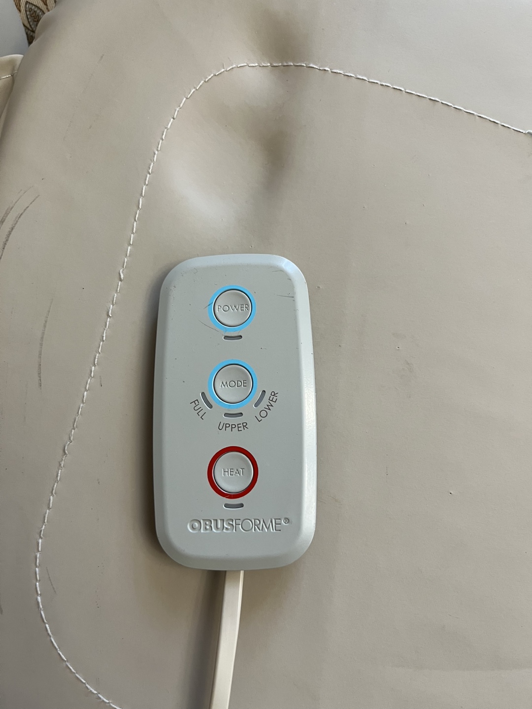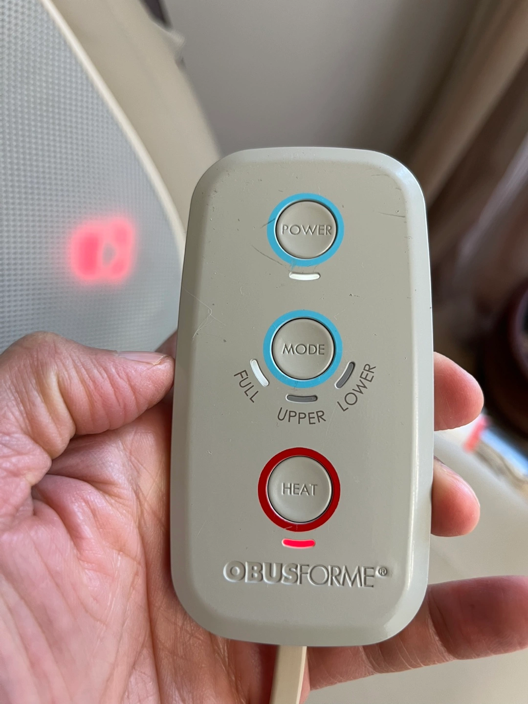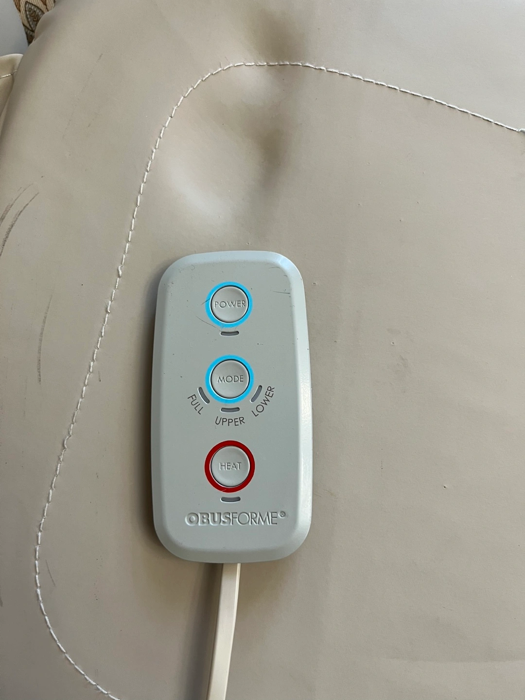 Selling an ObusForme massage seat cushion. It comes with a remote control that has buttons for power, mode, and heat. Perfect for relaxing after a long day!