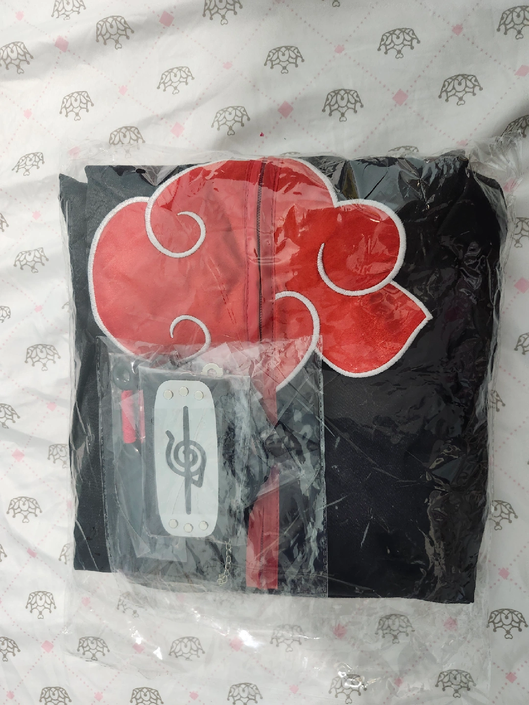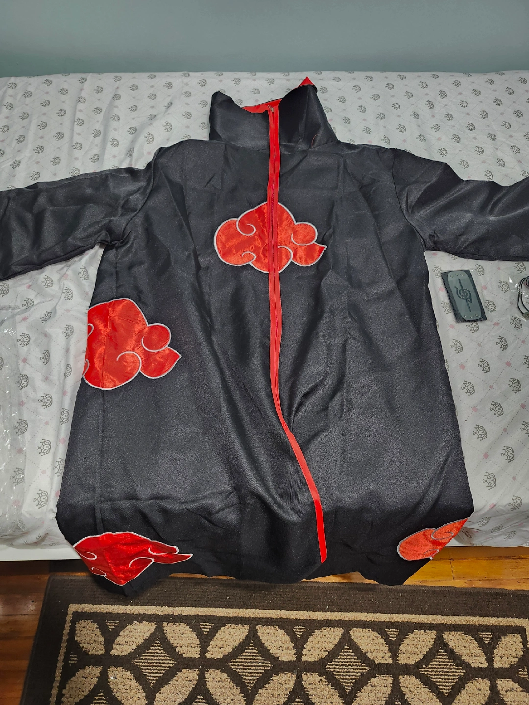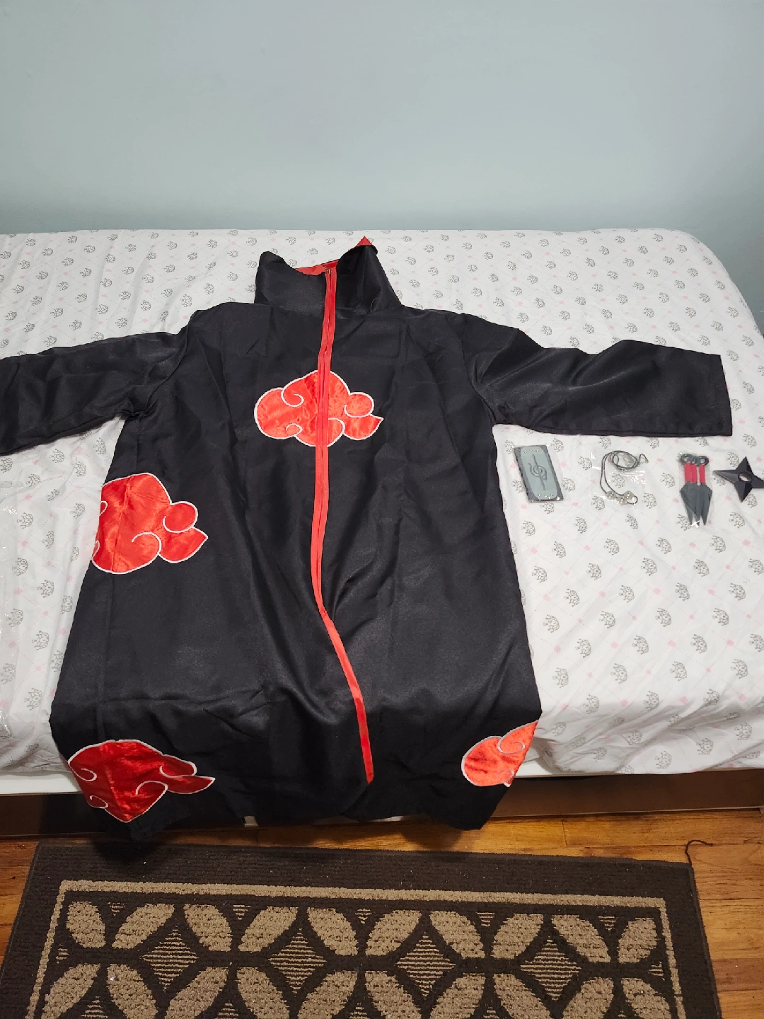 Selling an Akatsuki cloak cosplay costume set from Naruto! Includes the cloak with the iconic red clouds, a headband, a ring, a necklace, and some kunai and shuriken. Perfect for cosplay or any Naruto fan! Brand New Can also be used as a great holloween costume