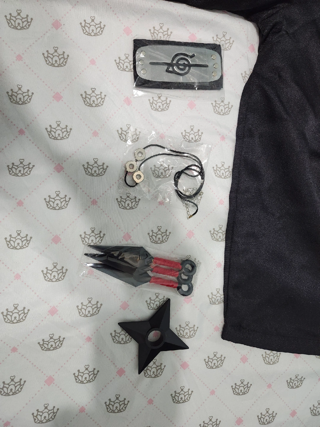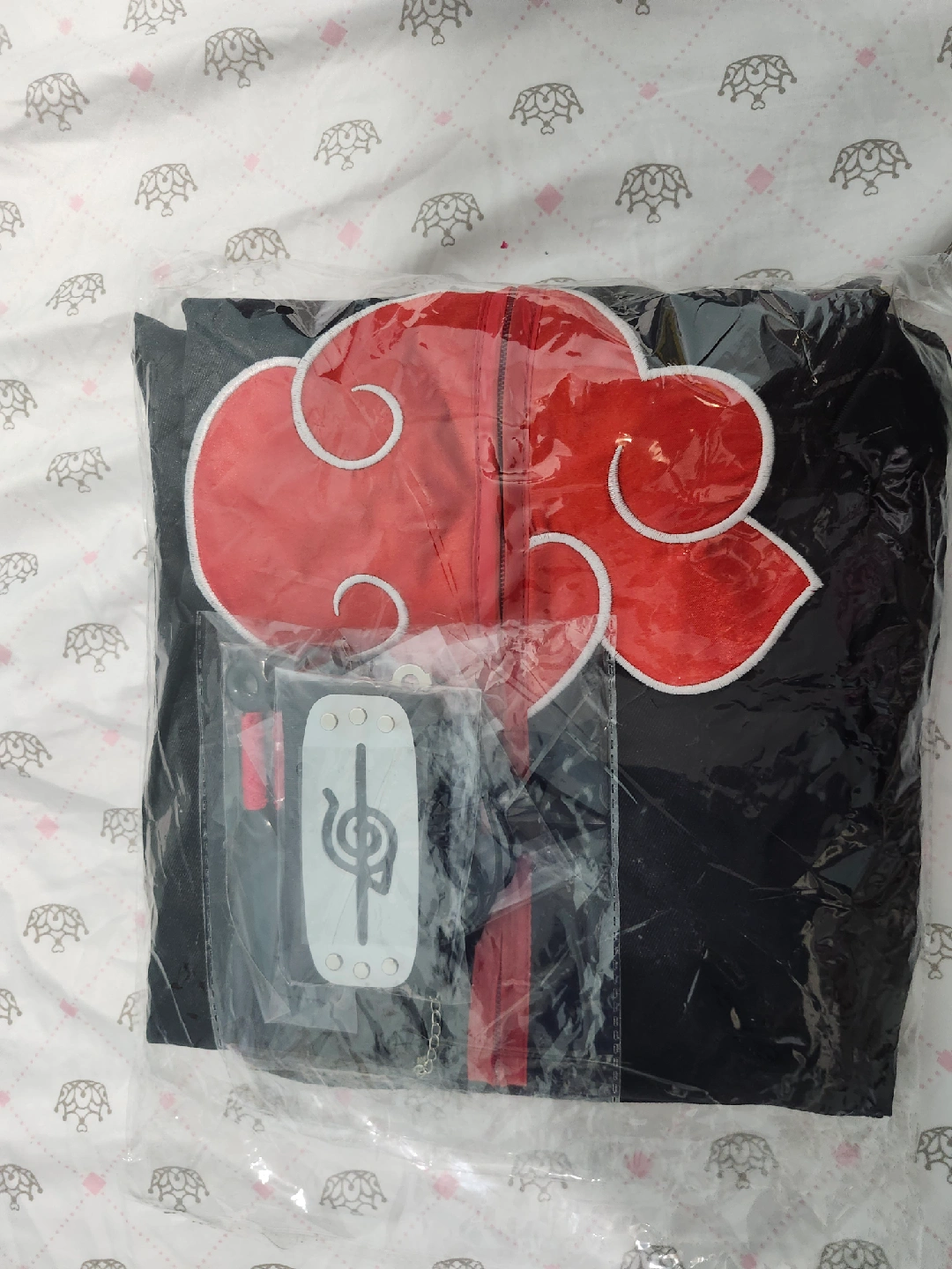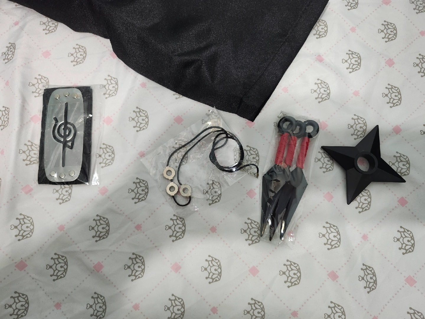 Selling an Akatsuki cloak cosplay costume set from Naruto! Includes the cloak with the iconic red clouds, a headband, a ring, a necklace, and some kunai and shuriken. Perfect for cosplay or any Naruto fan! Brand New Can also be used as a great holloween costume