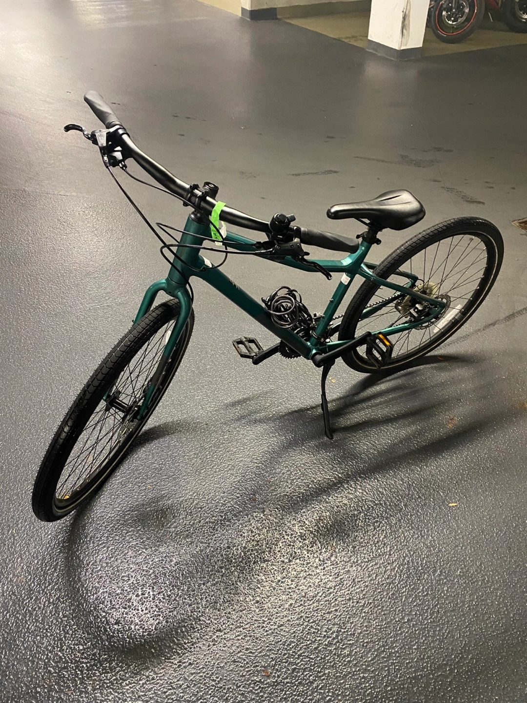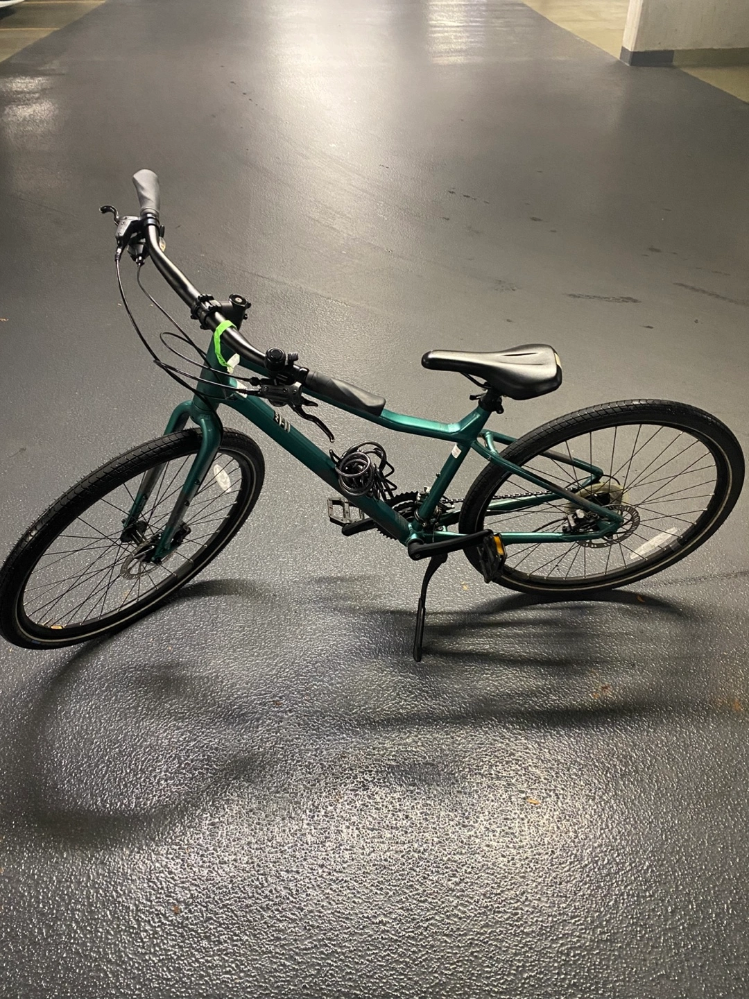 Selling a green hybrid bike in great condition! Perfect for city commutes or leisurely rides around town. It's ready for a new home and some adventures. It goes with helmet and two bike locks.