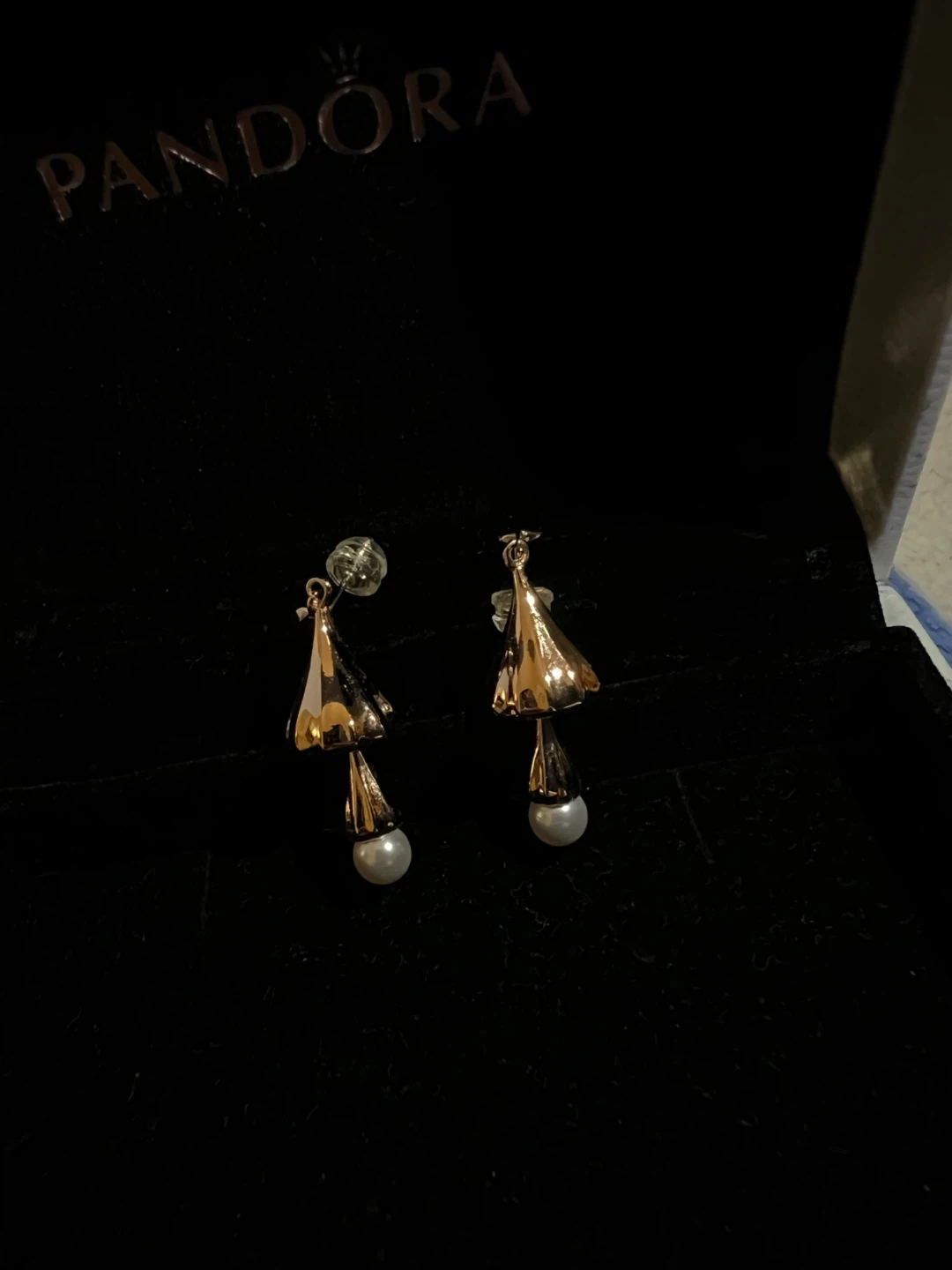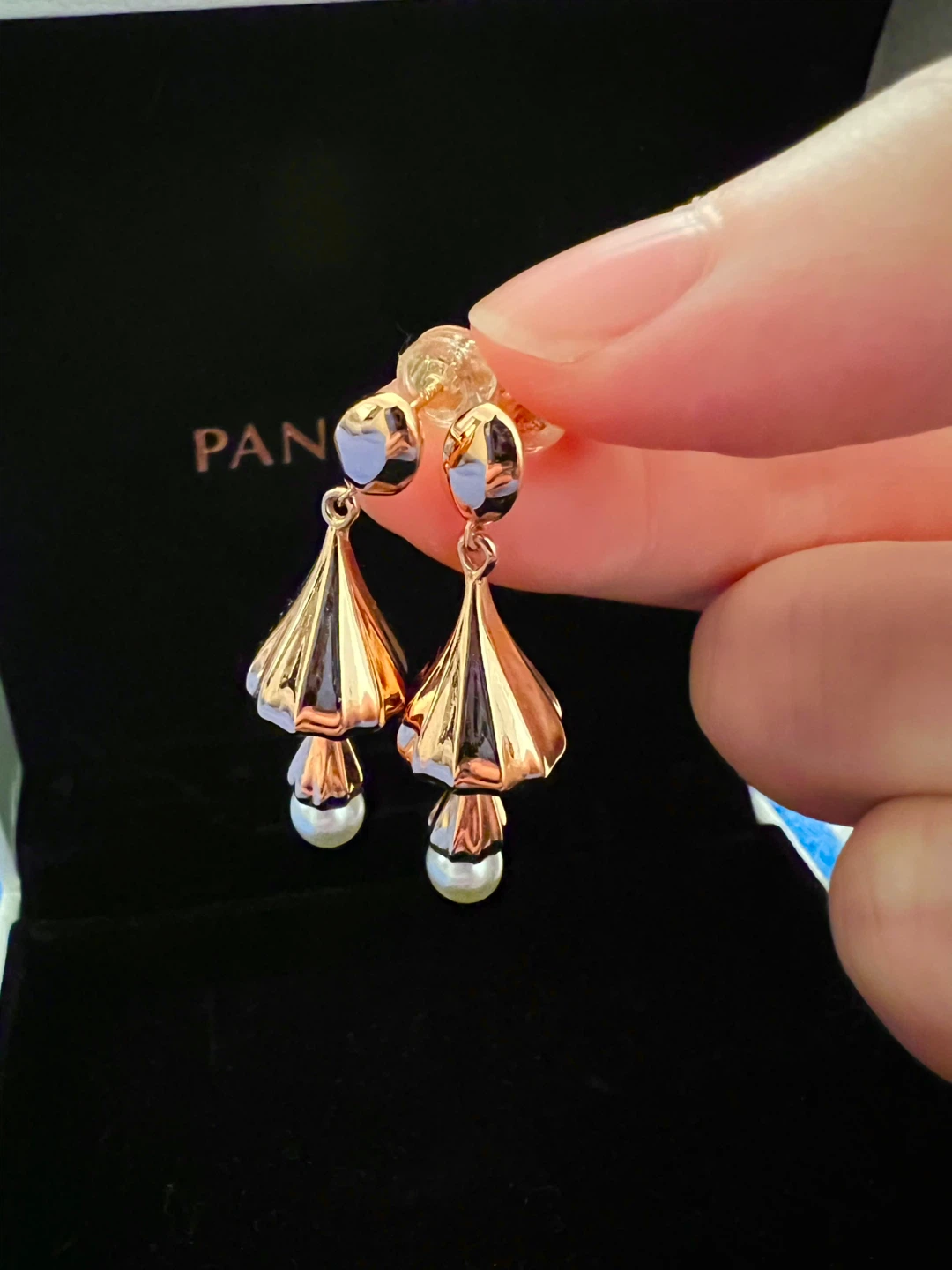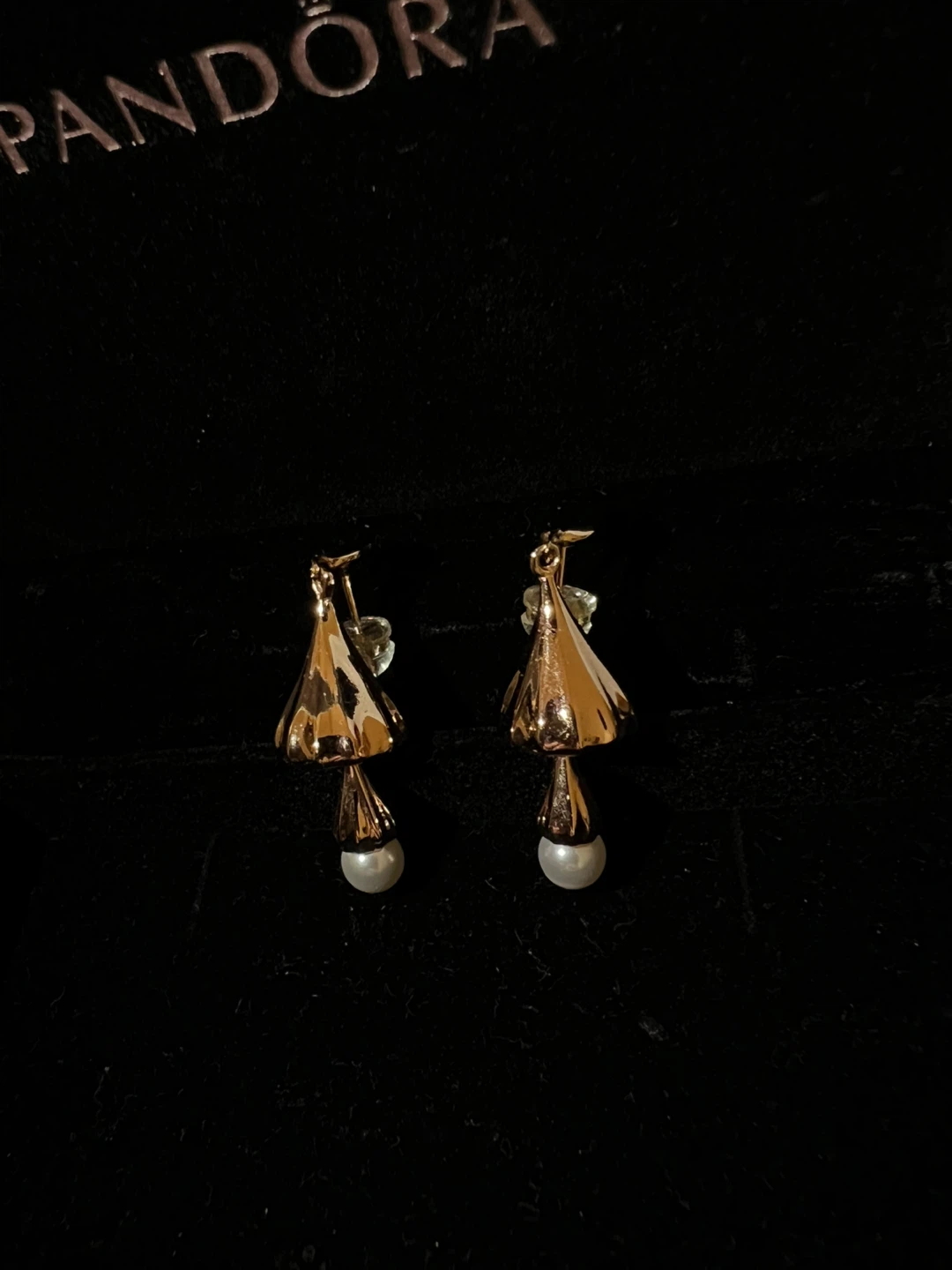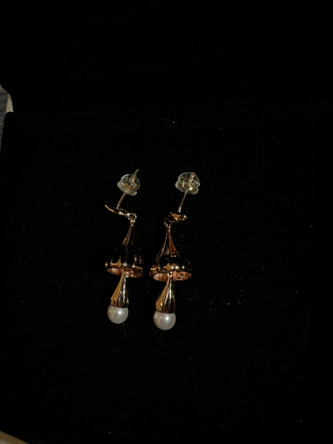 Selling a new pair of earrings in rose gold with a pearl accent.