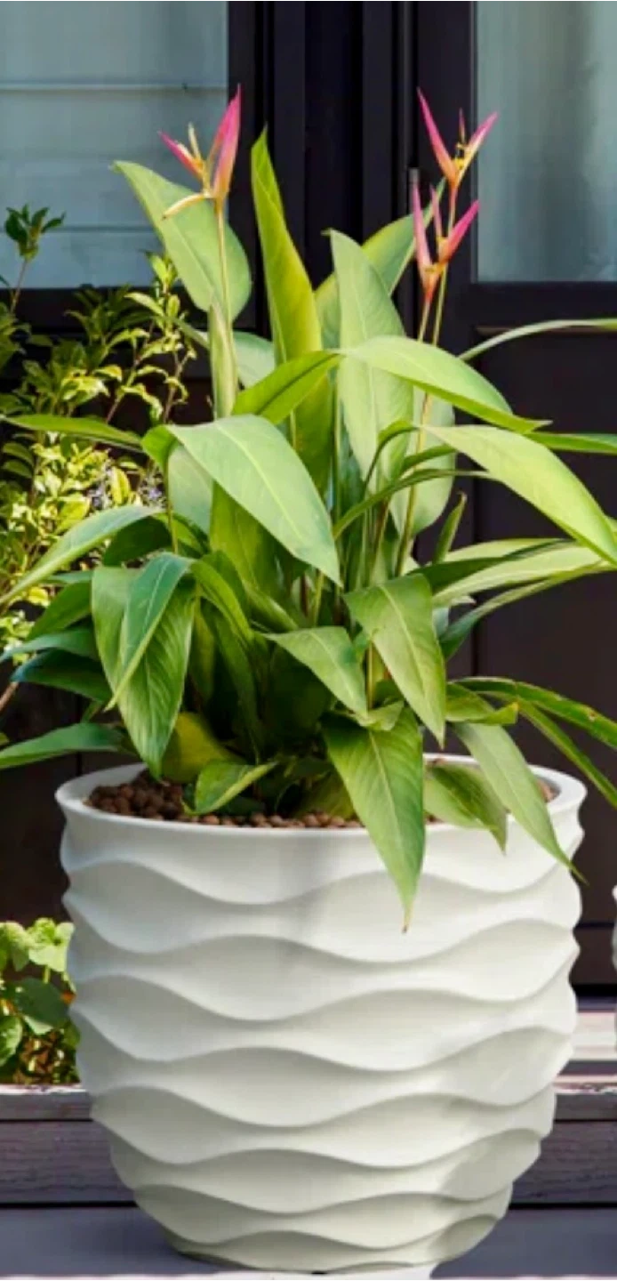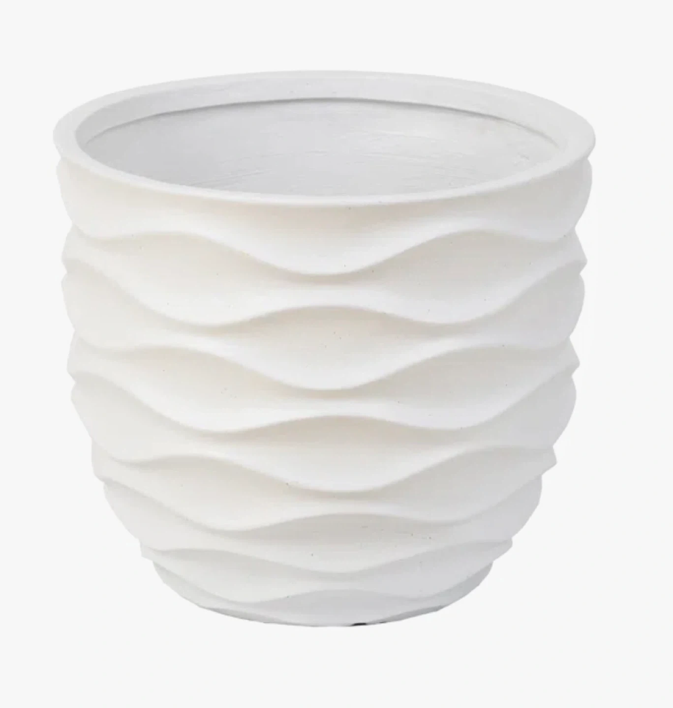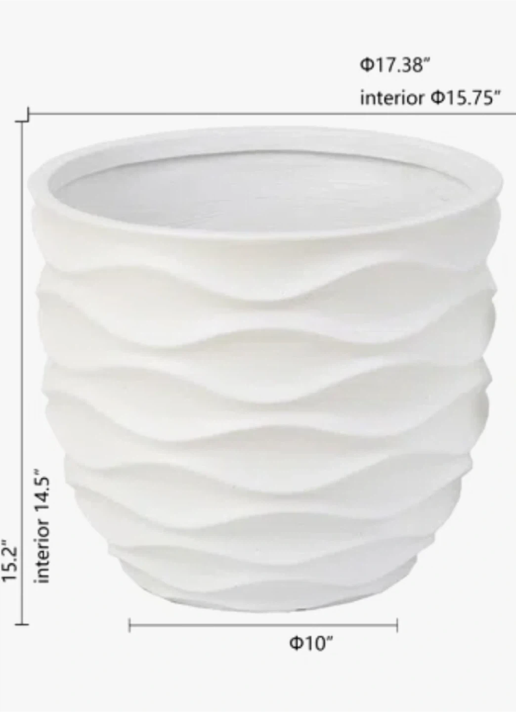 10Selling a lovely white planter pot with a unique wave pattern! It's perfect for adding a touch of elegance to your indoor or outdoor space. Here are the approximate dimensions: - Top Diameter: 17.38 inches - Interior Top Diameter: 15.75 inches - Height: 15.2 inches - Interior Height: 14.5 inches - Base Diameter: 10 inches