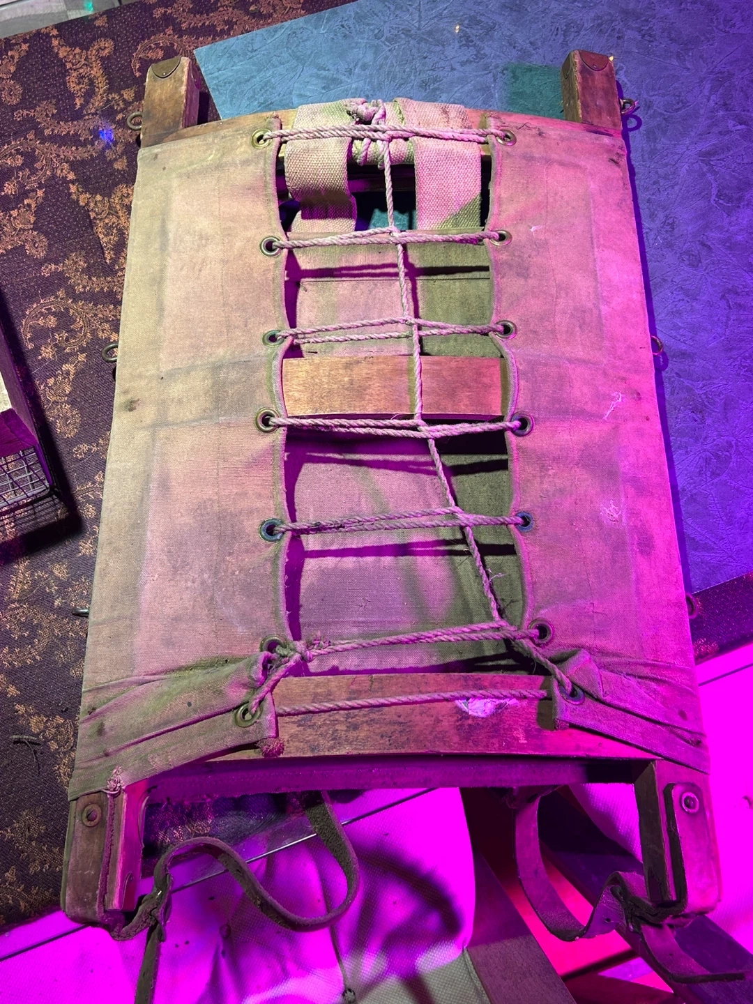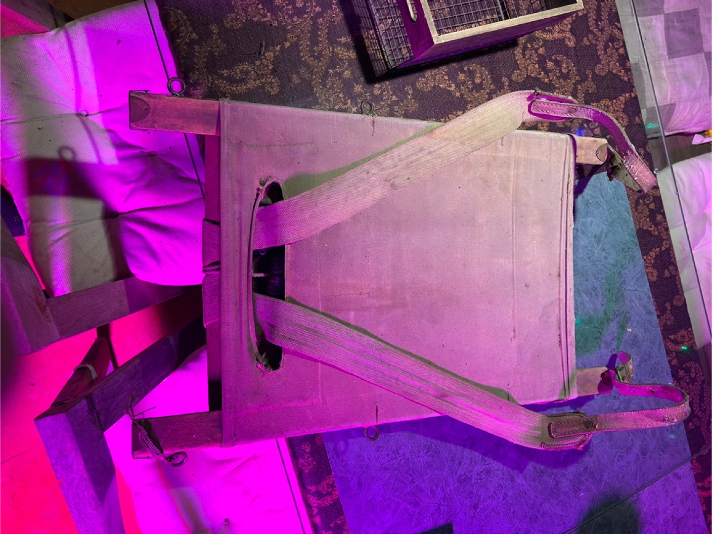 Made of wood, canvas, leather, and brass. Lightweight with adjustable straps.