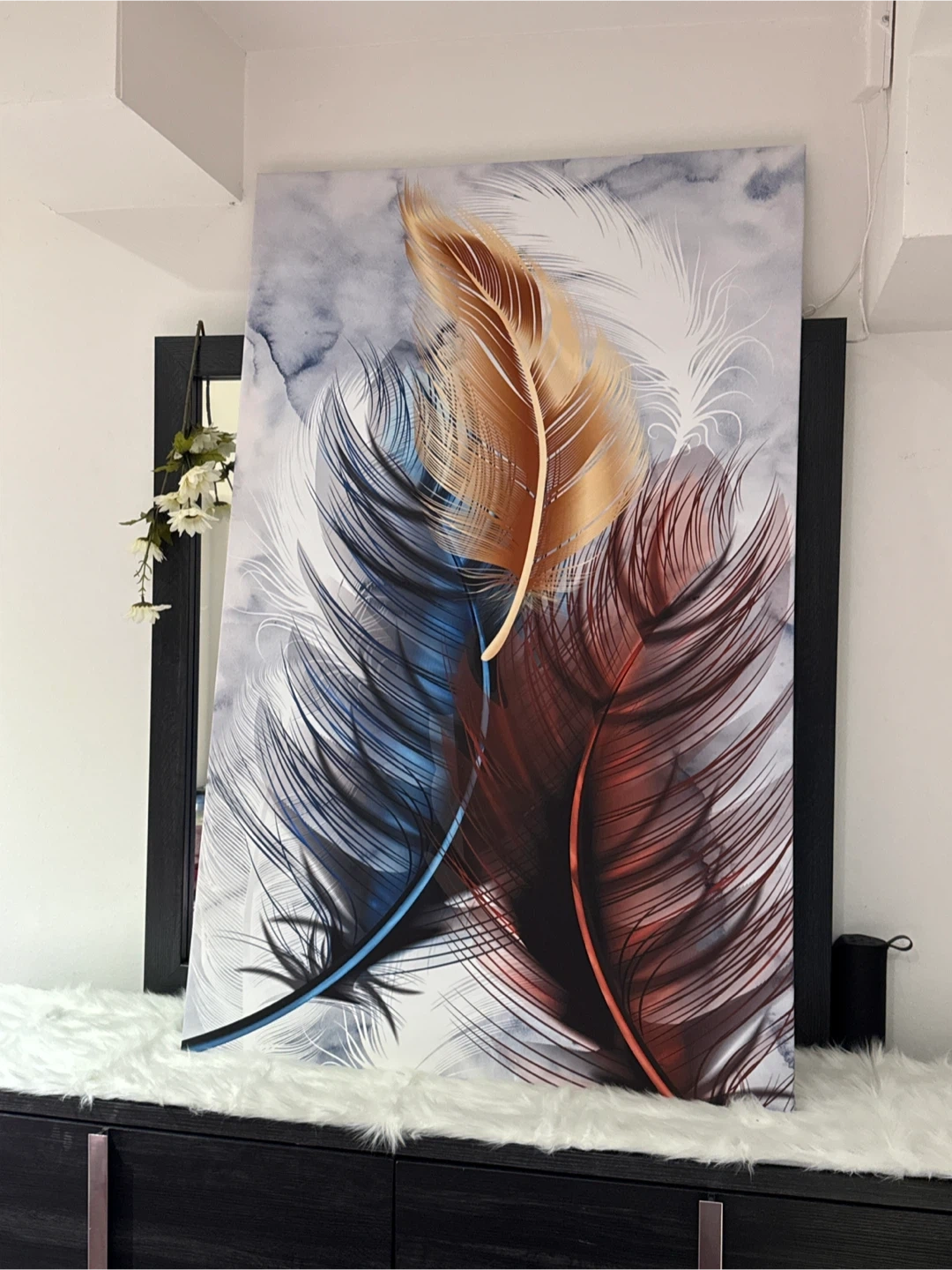 Add a touch of elegance to your home with this beautiful feather wall art! The canvas features a stylish design with gold, blue, and brown feathers. It's perfect for adding a pop of colour and sophistication to any room in your home Size 50x32 inches