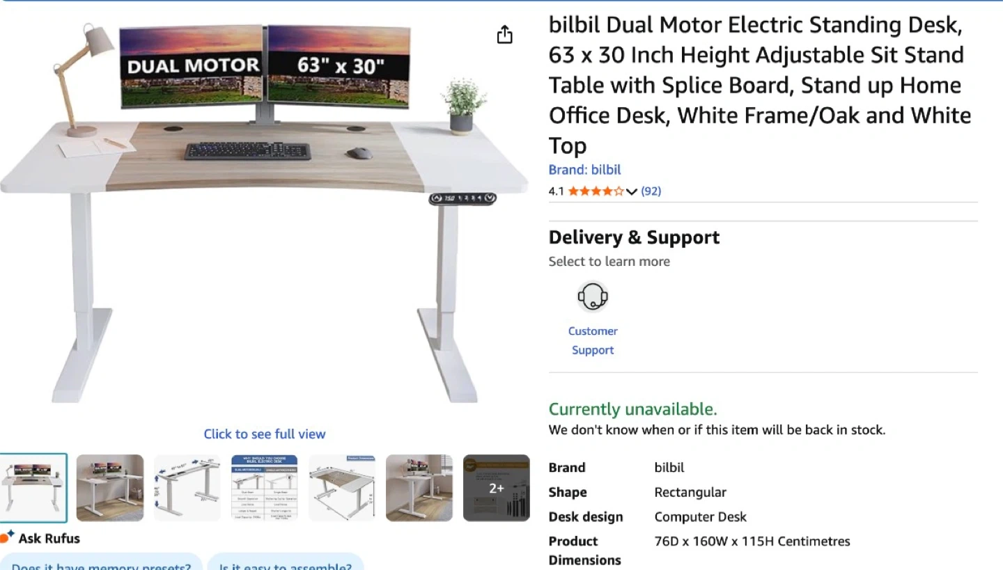 Selling a bilbil dual motor electric standing desk! It's 63 x 30 inches and height adjustable. This sit-stand table has a splice board, perfect as a stand-up home office desk with a white frame and oak and white top. Dimensions are 76D x 160W x 115H Centimetres