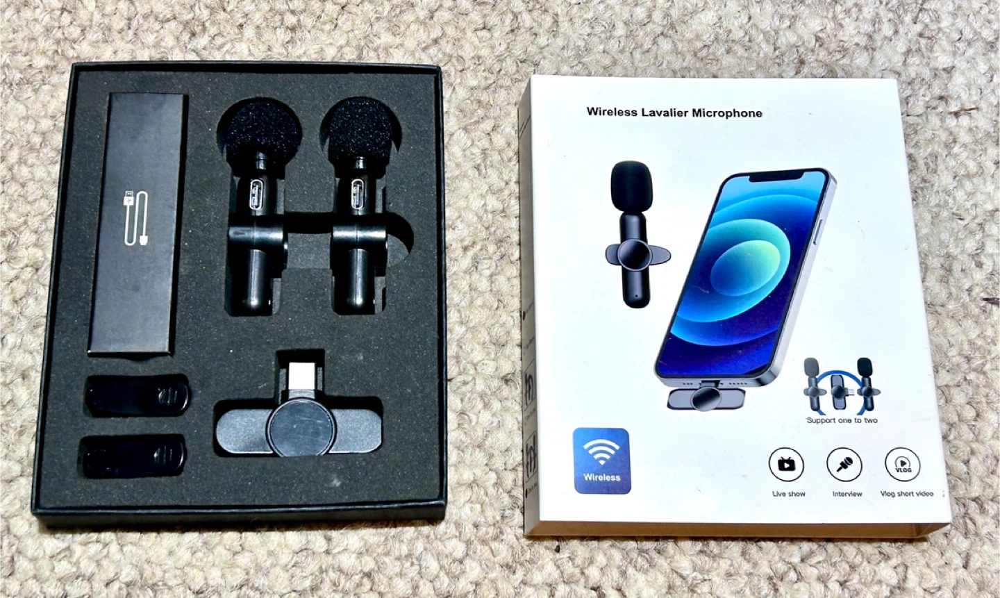 2 Wireless Lavelier microphones for Android phones or tablets. 20 metre range. New and unused.