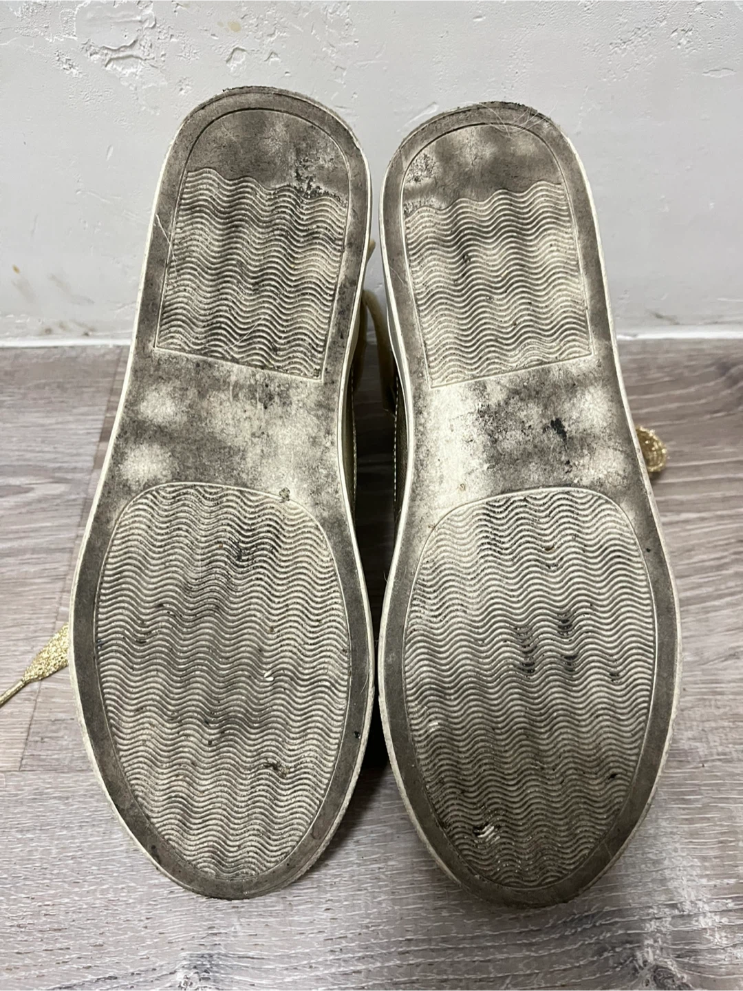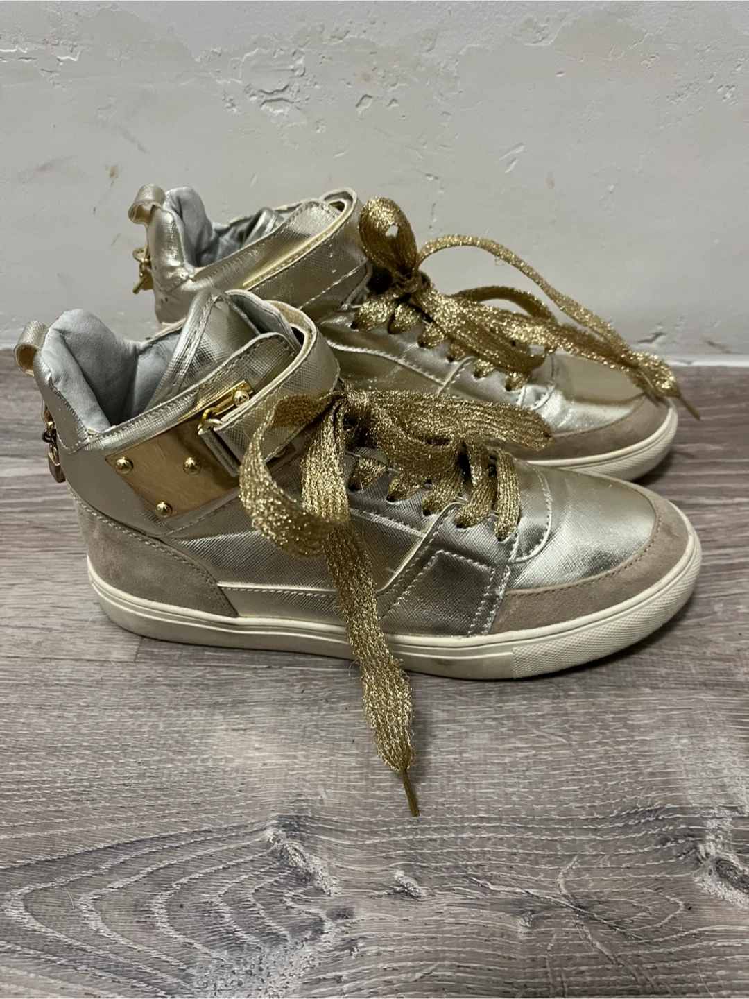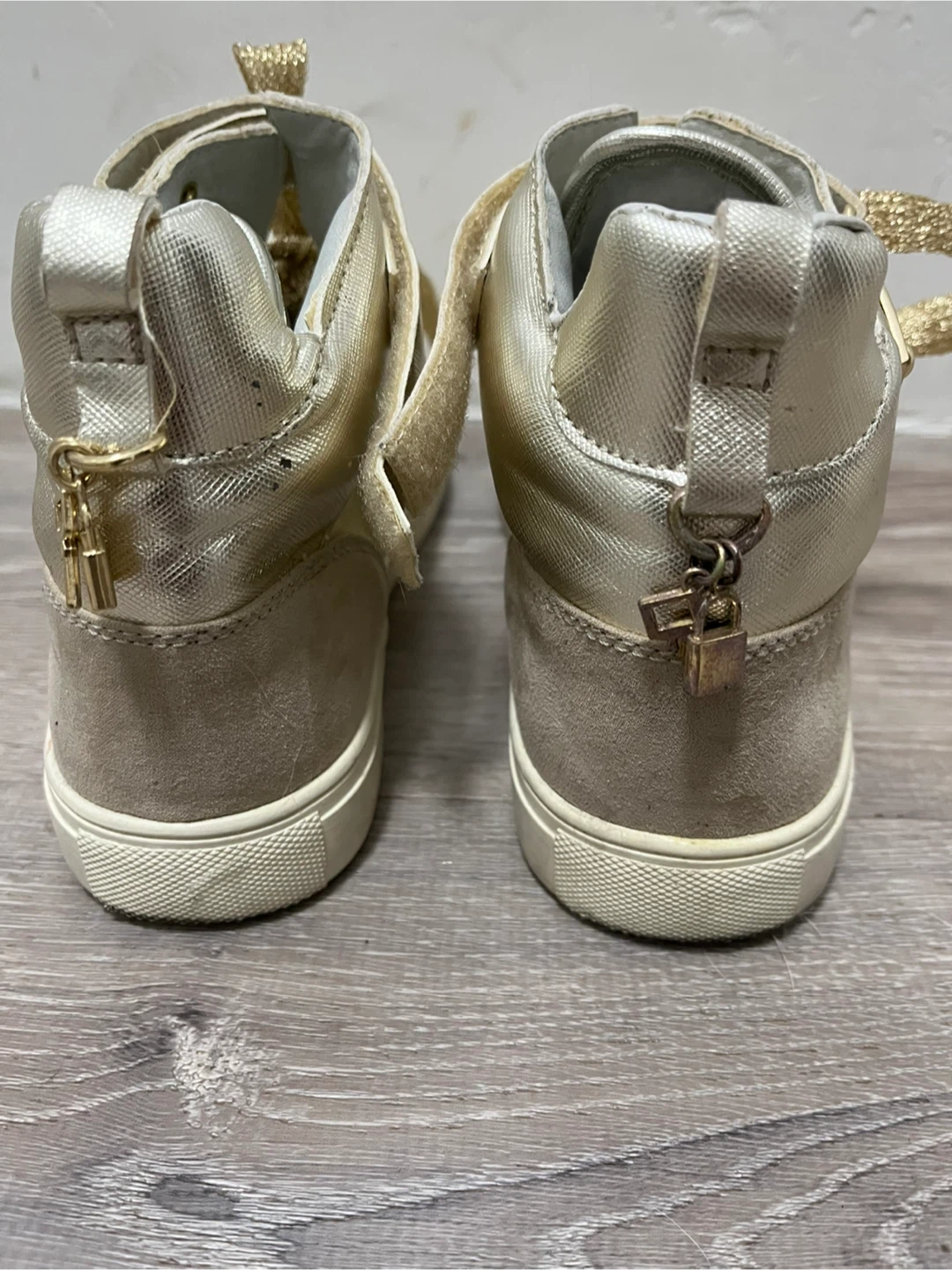 Madden Girl high top sneakers in gold with lock & charms in the back, shiny laces & Velcro straps.