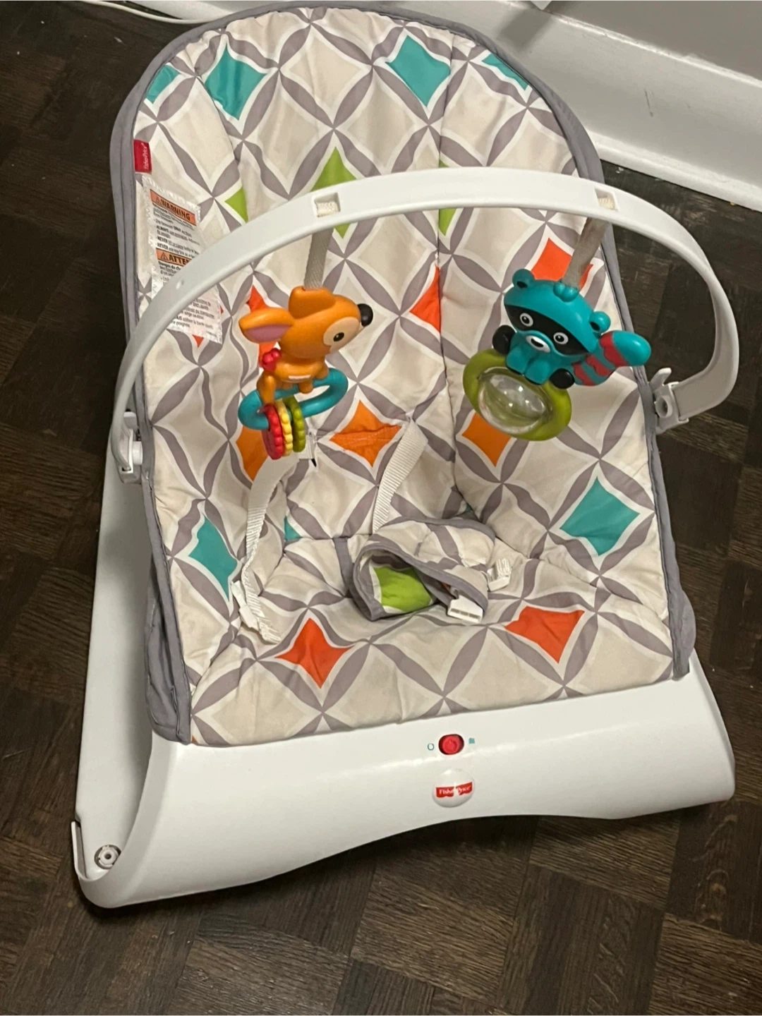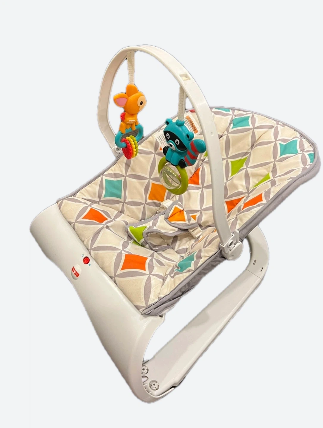 Selling a Fisher-Price baby bouncer seat! It's in great shape and ready for a new home. It features a fun pattern and includes the toy bar with hanging toys to keep your little one entertained