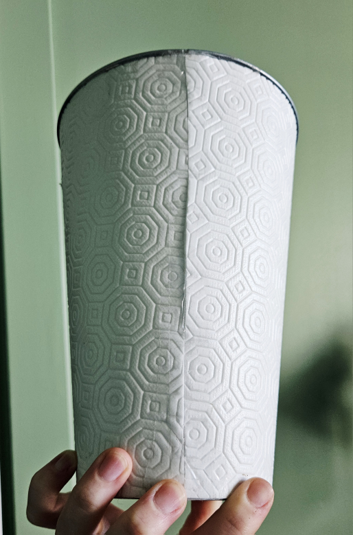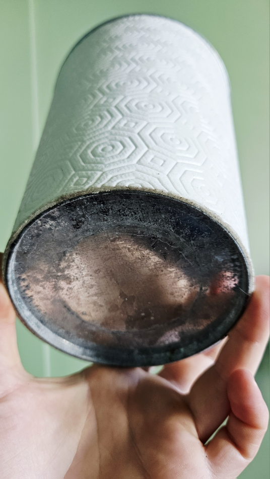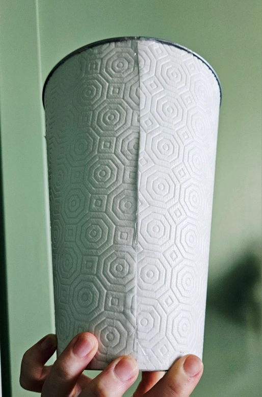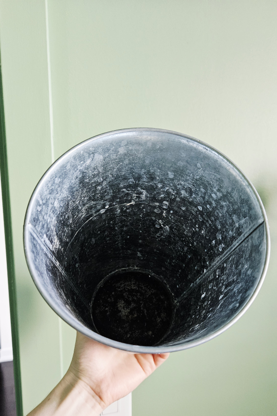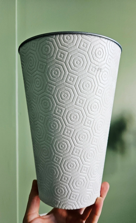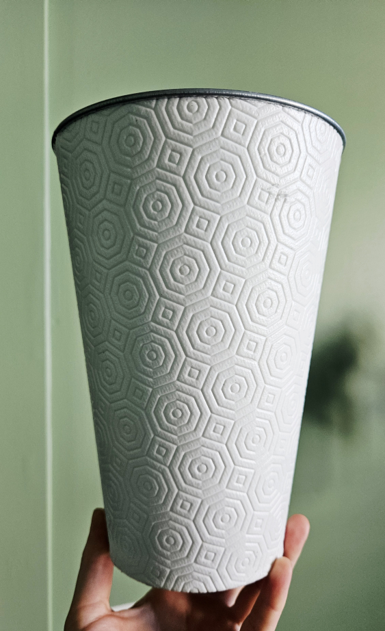 Selling a white metal bucket with an embossed geometric pattern. It has a silver rim. There are some signs of use on the bottom and inside, as shown in the pictures