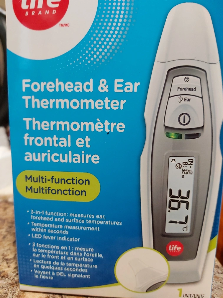 Selling a brand new Life Brand forehead and ear thermometer. It's a multi-function thermometer that measures ear, forehead, and surface temperatures. It also provides temperature measurement within seconds and has an LED fever indicator