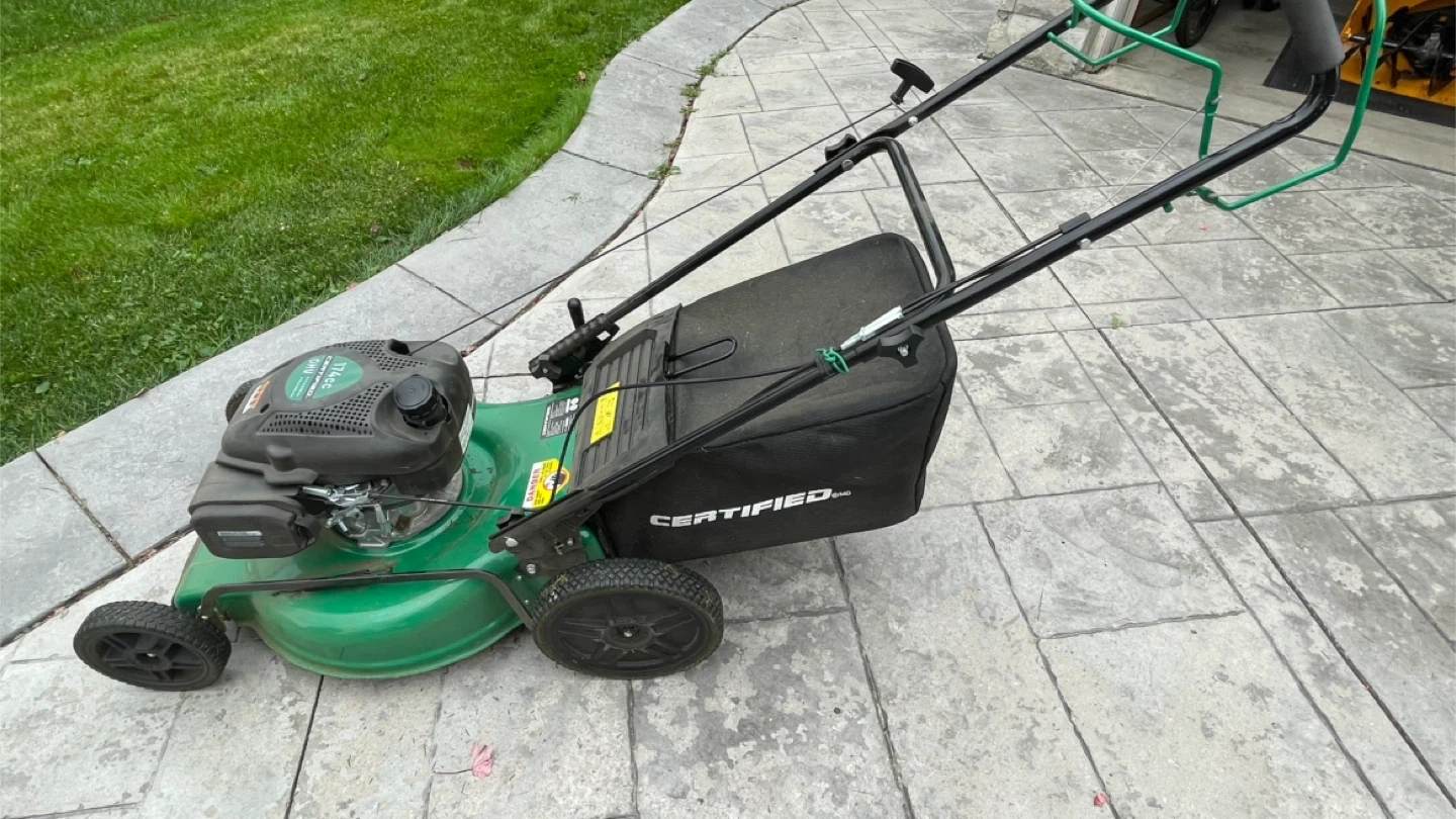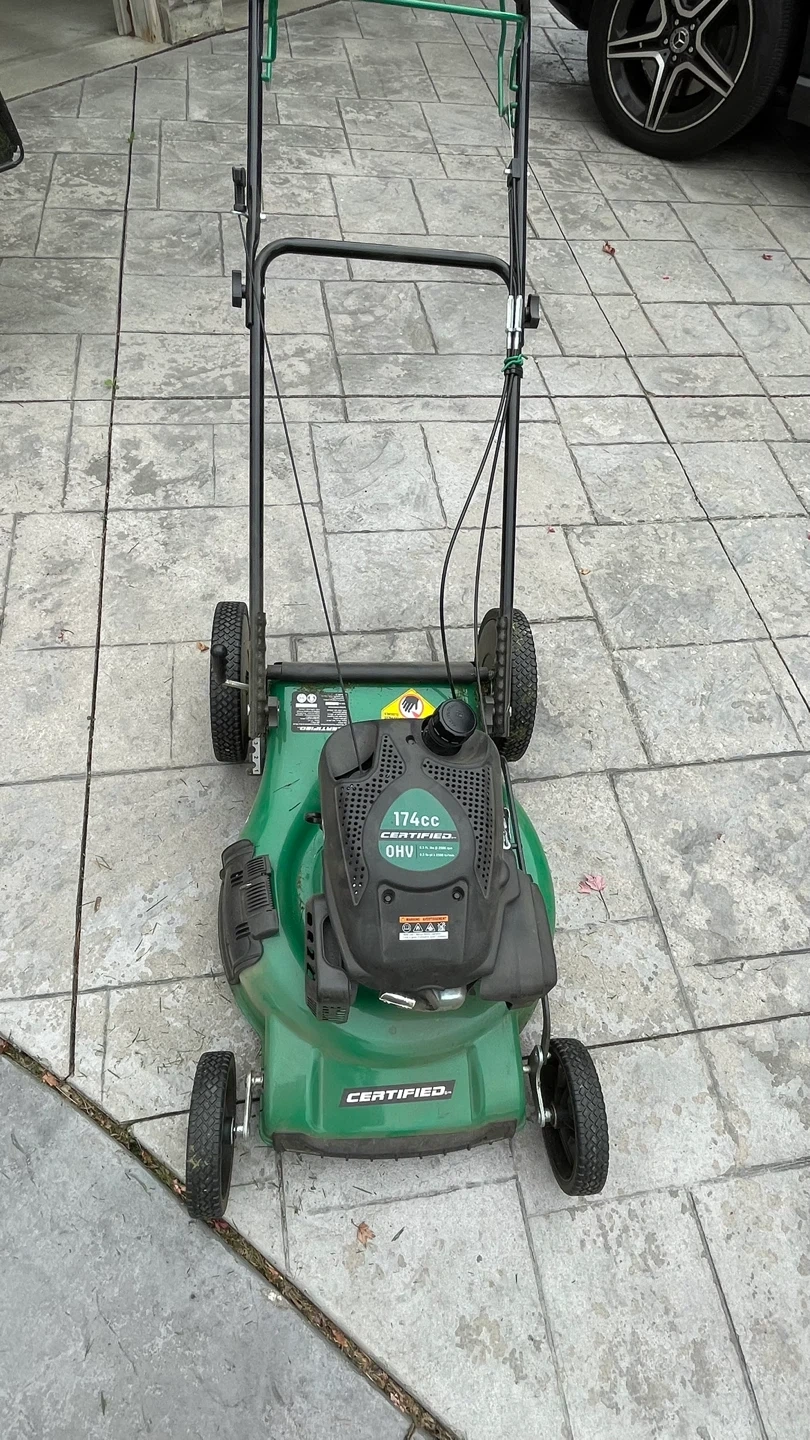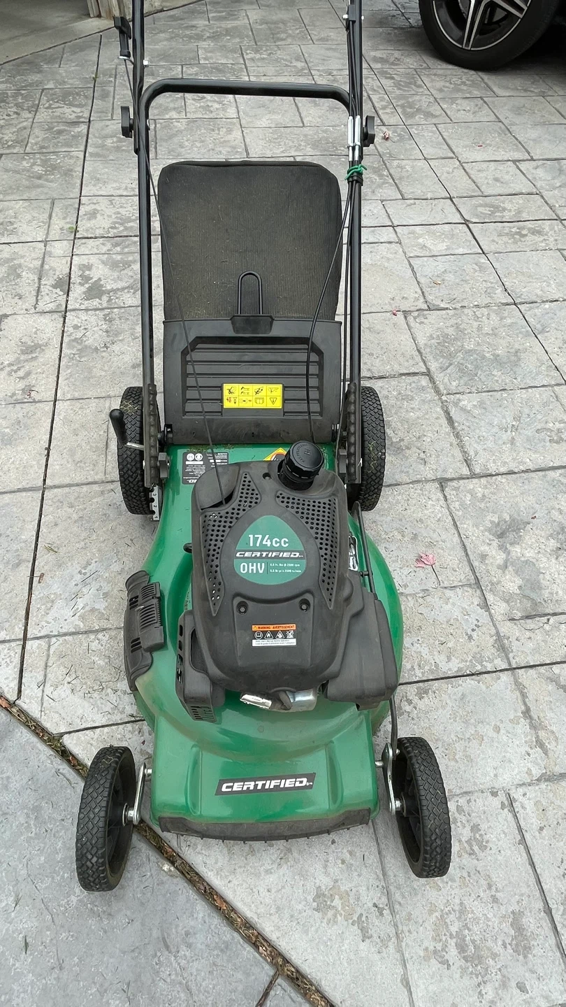 Selling a Certified lawn mower with a 174cc engine. It's green and has a grass catcher bag included. Ready to keep your lawn looking great!