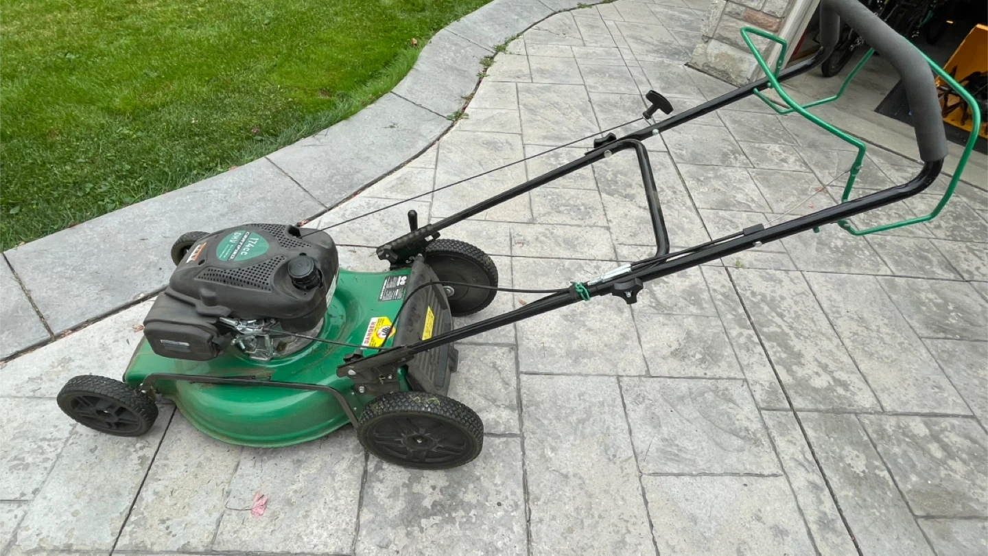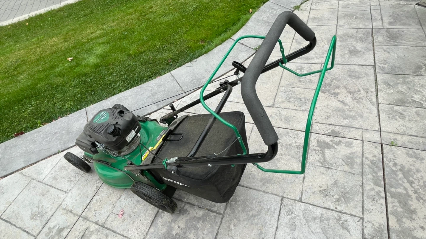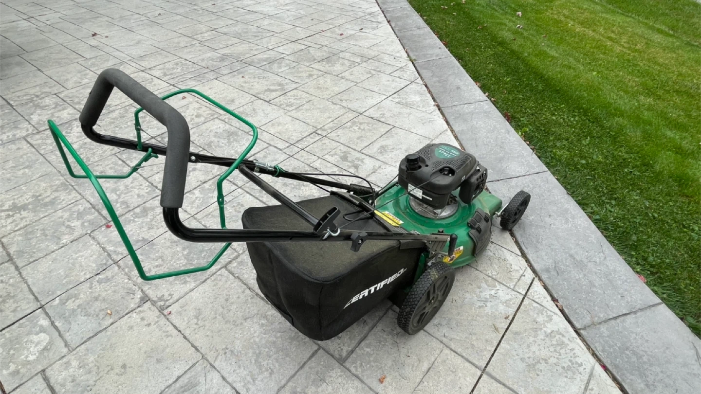Selling a Certified lawn mower with a 174cc engine. It's green and has a grass catcher bag included. Ready to keep your lawn looking great!