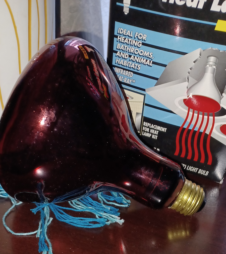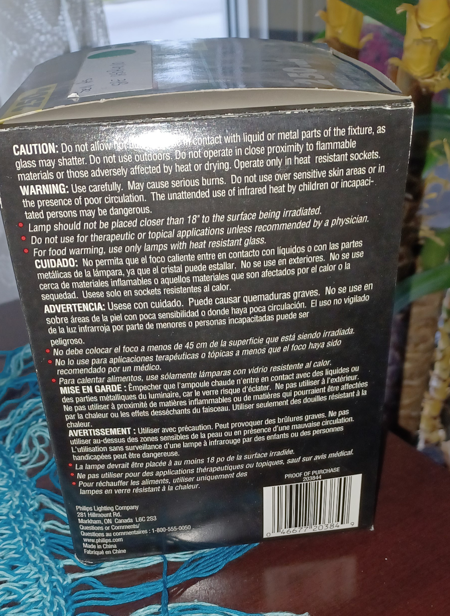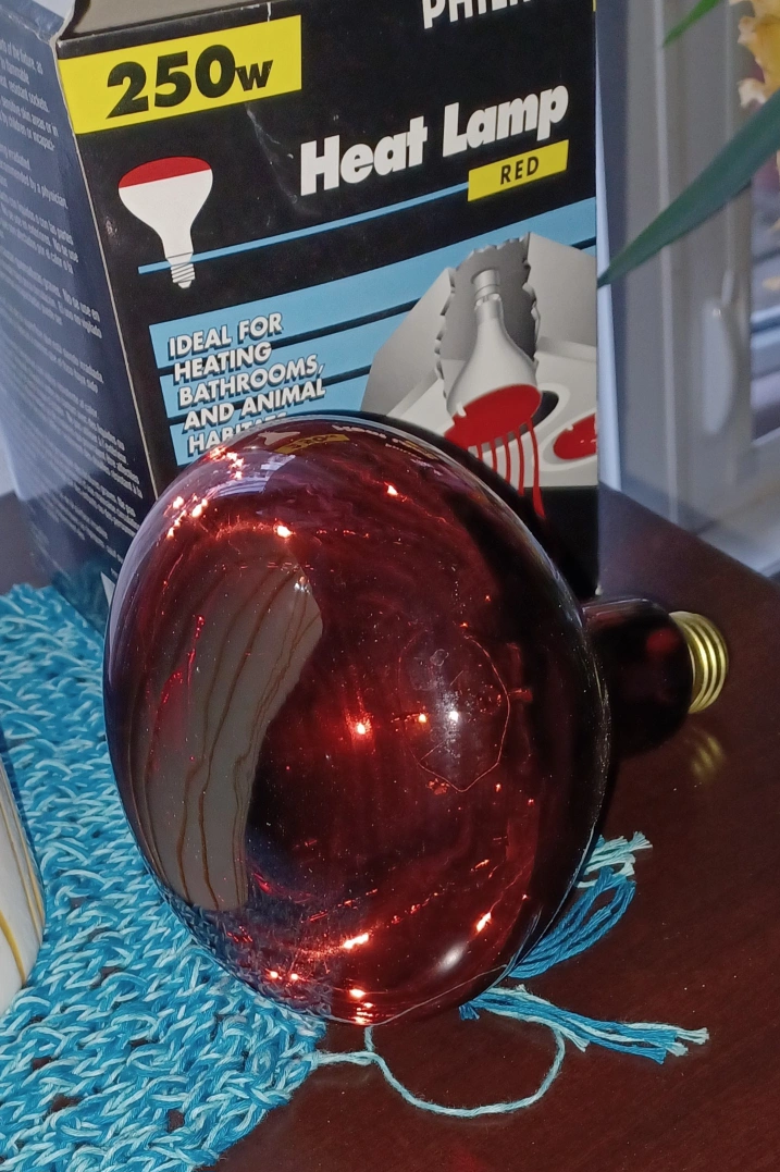 Selling a Philips 250W red heat lamp. Ideal for heating bathrooms and animal habitats. It's an infrared heat-ray lamp and contains 1 R40 (5" diameter) light bulb.