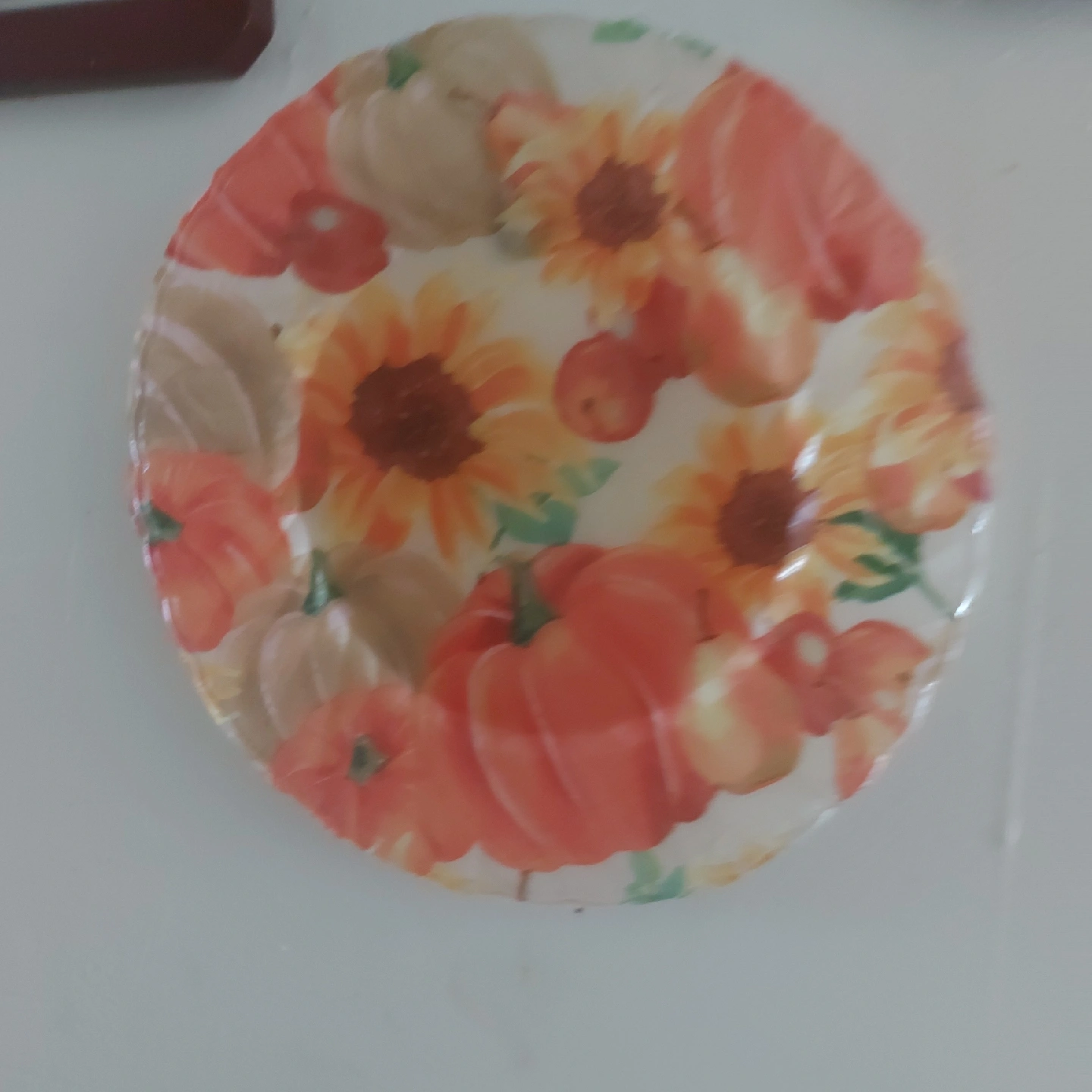 75This is a plate with a sunflower and pumpkin design. It's perfect for fall decor or serving snacks!