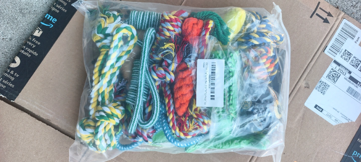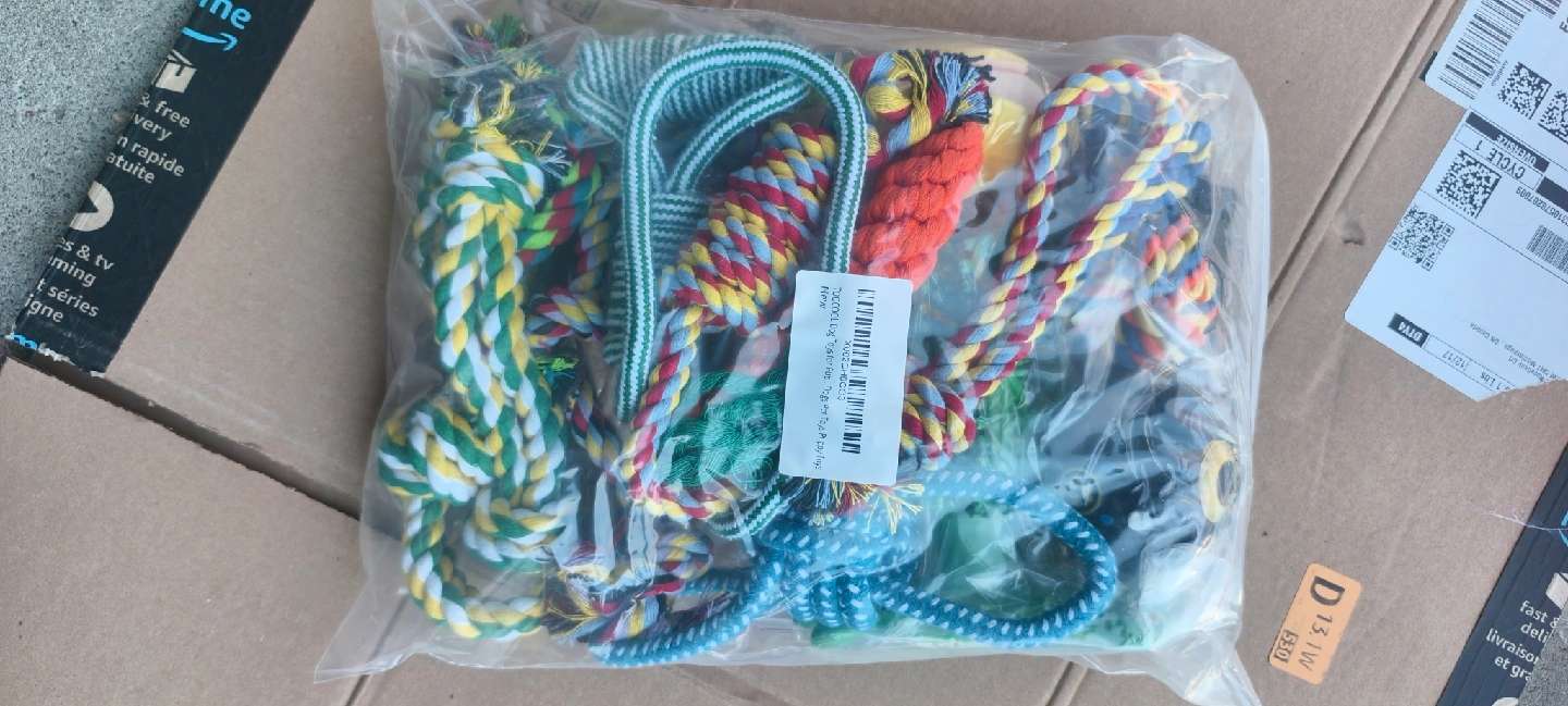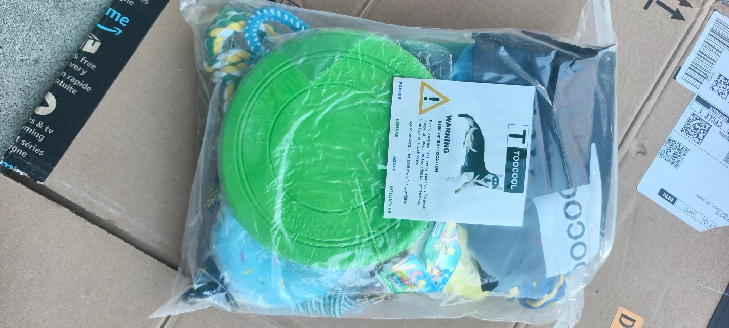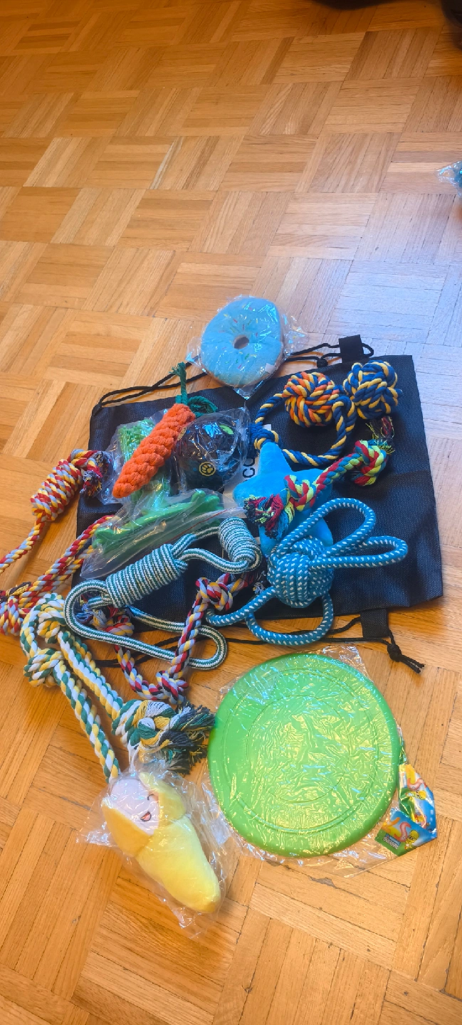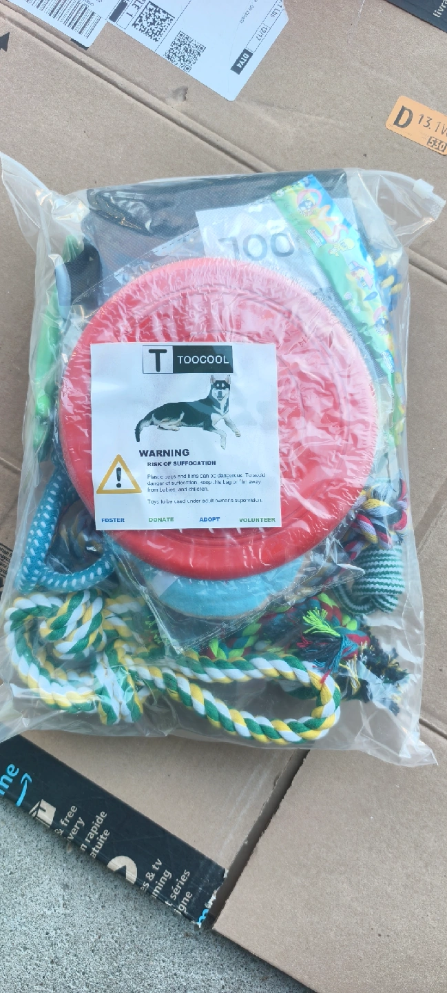 I'm selling a brand new set of dog toys from TooCool! It includes a variety of rope toys, a frisbee, and other fun items to keep your furry friend entertained. All still in the original packaging, never opened! 2 for 30.