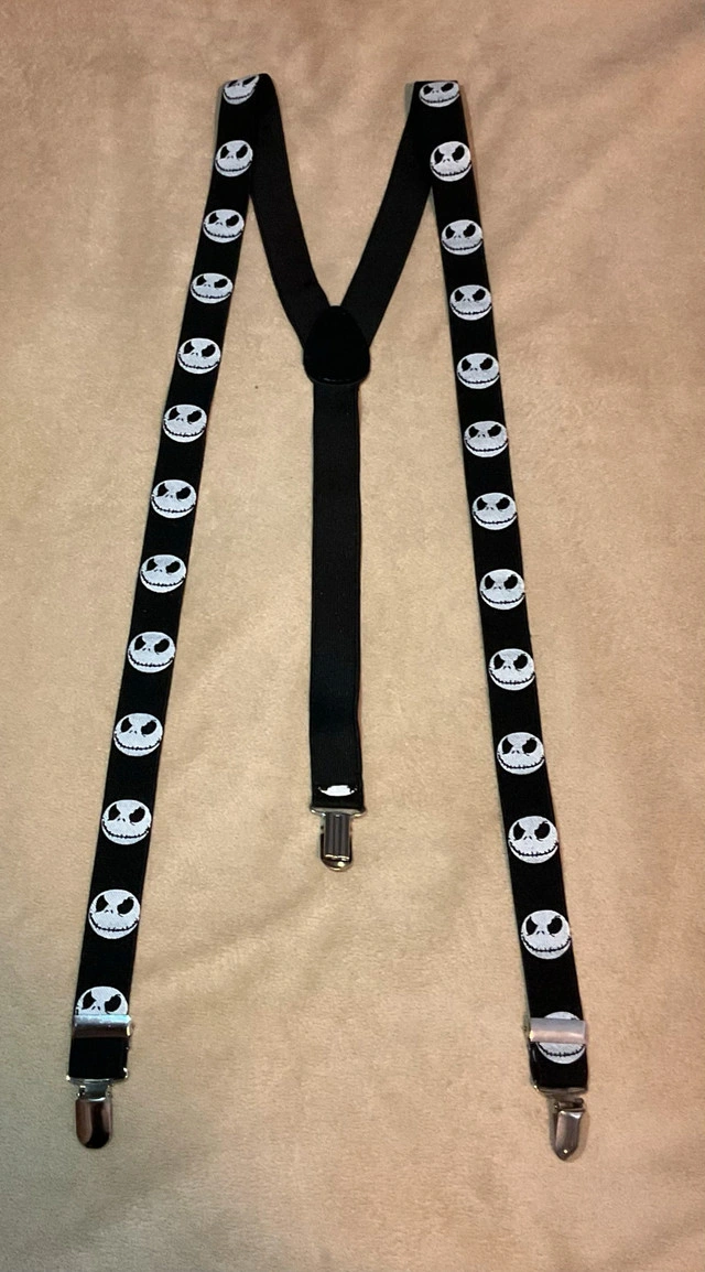 Jack Skellington Suspenders. I just have no more interest in wearing them anymore. I’m looking to get $5 cash for them. They’re in good condition, no lose threads, no rips, clamps are clean and work fine. Message if more photos are needed. Door pickup please. Thanks.